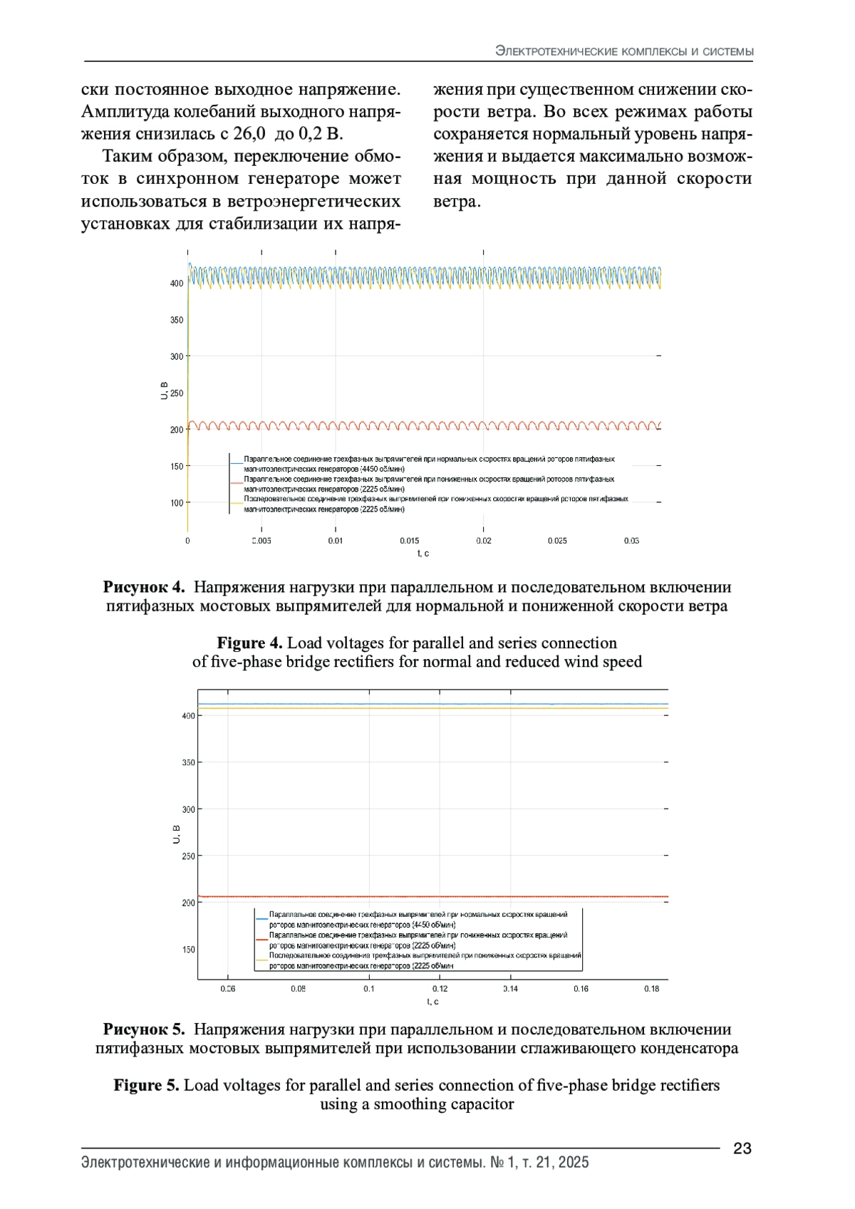 Статья: МОДЕЛИРОВАНИЕ ВЕТРОУСТАНОВКИ НА БАЗЕ ДВУХ ПЯТИФАЗНЫХ МАГНИТОЭЛЕКТРИЧЕСКИХ ГЕНЕРАТОРОВ СО СТАБИЛИЗАЦИЕЙ НАПРЯЖЕНИЯ ПРИ ИЗМЕНЯЮЩЕЙСЯ СКОРОСТИ ВЕТРА (2025)