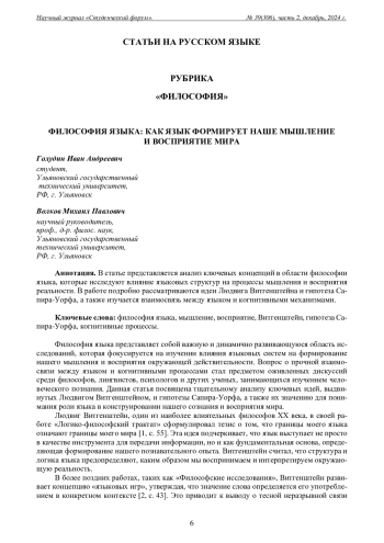 В статье представляется анализ ключевых концепций в области философии языка, которые исследуют влияние языковых структур на процессы мышления и восприятия реальности. В работе подробно рассматриваются идеи Людвига Витгенштейна и гипотеза Сапира-Уорфа, а также изучается взаимосвязь между языком и когнитивными механизмами