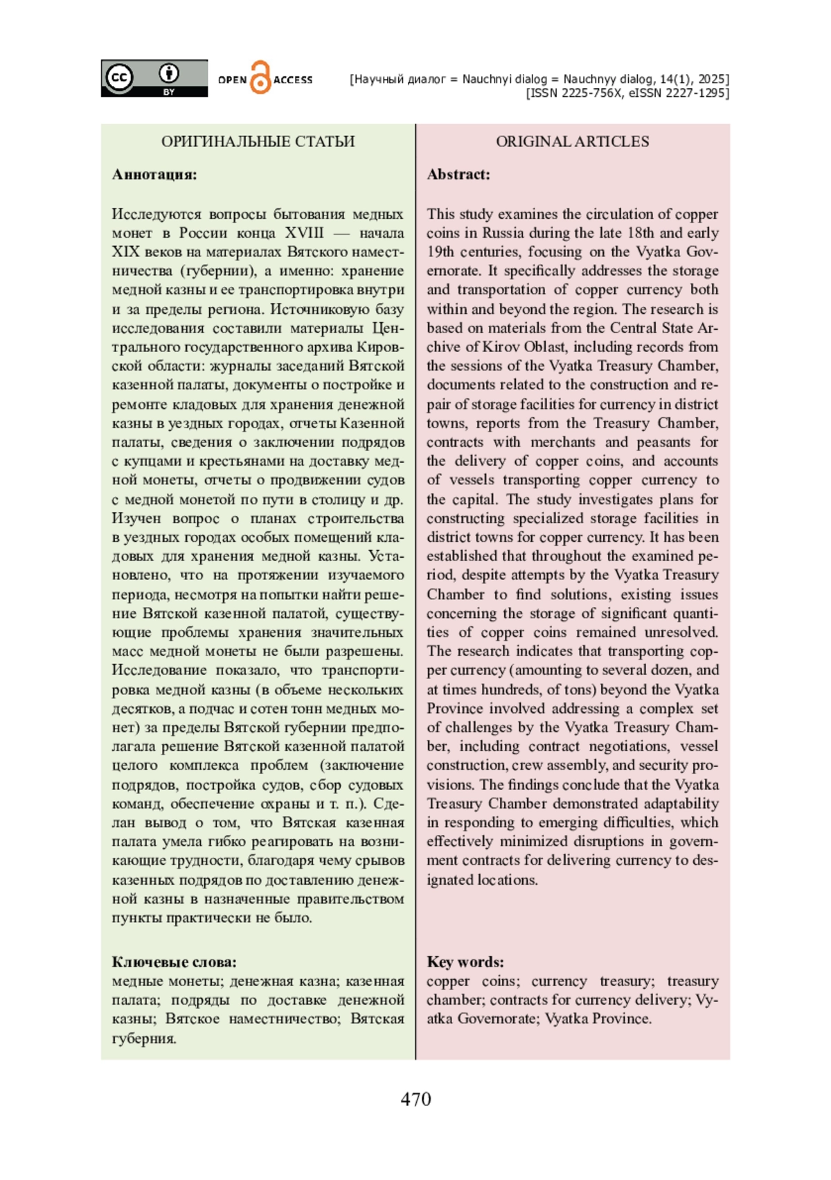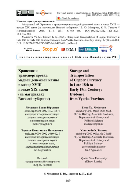 Исследуются вопросы бытования медных монет в России конца XVIII — начала XIX веков на материалах Вятского наместничества (губернии), а именно: хранение медной казны и ее транспортировка внутри и за пределы региона. Источниковую базу исследования составили материалы Центрального государственного архива Кировской области: журналы заседаний Вятской казенной палаты, документы о постройке и ремонте кладовых для хранения денежной казны в уездных городах, отчеты Казенной палаты, сведения о заключении подрядов с купцами и крестьянами на доставку медной монеты, отчеты о продвижении судов с медной монетой по пути в столицу и др. Изучен вопрос о планах строительства в уездных городах особых помещений кладовых для хранения медной казны. Установлено, что на протяжении изучаемого периода, несмотря на попытки найти решение Вятской казенной палатой, существующие проблемы хранения значительных масс медной монеты не были разрешены. Исследование показало, что транспортировка медной казны (в объеме нескольких десятков, а подчас и сотен тонн медных монет) за пределы Вятской губернии предполагала решение Вятской казенной палатой целого комплекса проблем (заключение подрядов, постройка судов, сбор судовых команд, обеспечение охраны и т. п.). Сделан вывод о том, что Вятская казенная палата умела гибко реагировать на возникающие трудности, благодаря чему срывов казенных подрядов по доставлению денежной казны в назначенные правительством пункты практически не было.