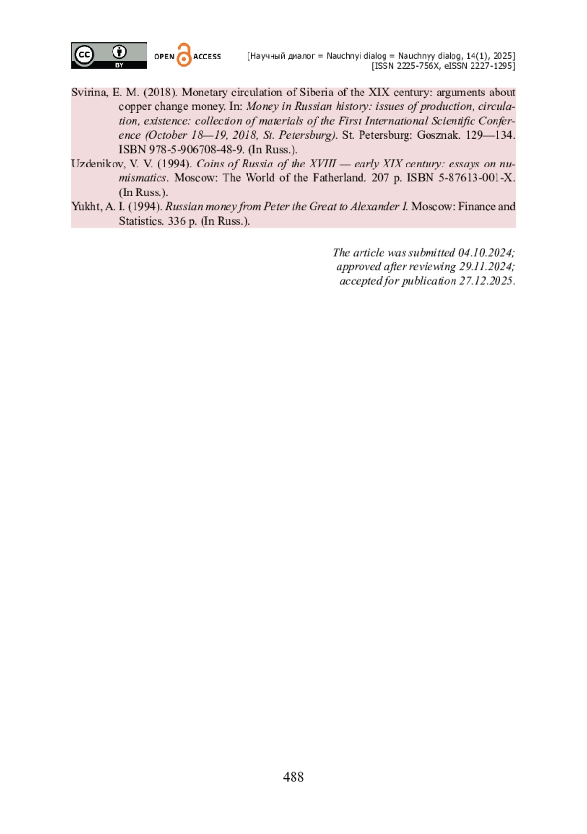 16. Свирина Е. М. Денежное обращение Сибири XIX века : рассуждения по поводу медных разменных денег / Е. М. Свирина // Деньги в российской истории : вопросы производства, обращения, бытования : сб. материалов Первой международной научной конференции (18-19 октября 2018 г., Санкт-Петербург). - Санкт-Петербург : Госзнак, 2018. - С. 129-134. - ISBN 978-5-906708-48-9.