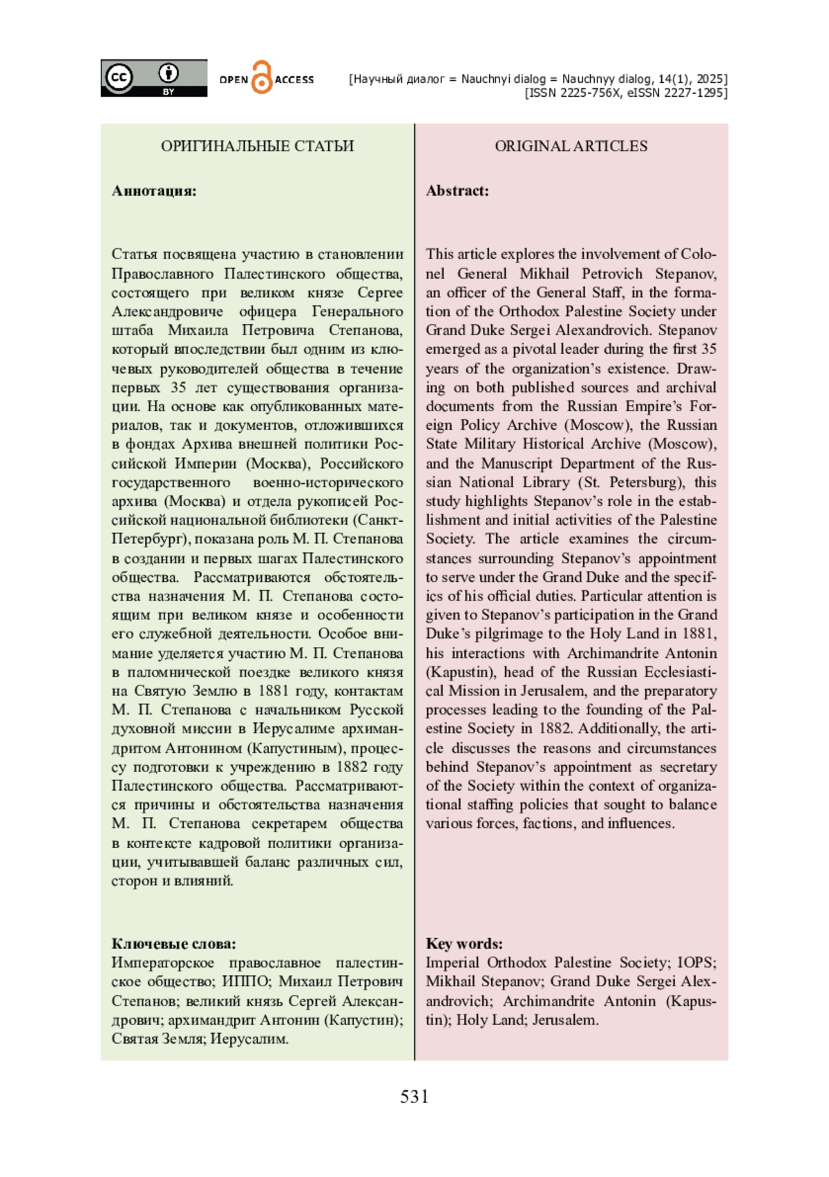 Статья посвящена участию в становлении Православного Палестинского общества, состоящего при великом князе Сергее Александровиче офицера Генерального штаба Михаила Петровича Степанова, который впоследствии был одним из ключевых руководителей общества в течение первых 35 лет существования организации. На основе как опубликованных материалов, так и документов, отложившихся в фондах Архива внешней политики Российской Империи (Москва), Российского государственного военно-исторического архива (Москва) и отдела рукописей Российской национальной библиотеки (Санкт-Петербург), показана роль М. П. Степанова в создании и первых шагах Палестинского общества. Рассматриваются обстоятельства назначения М. П. Степанова состоящим при великом князе и особенности его служебной деятельности. Особое внимание уделяется участию М. П. Степанова в паломнической поездке великого князя на Святую Землю в 1881 году, контактам М. П. Степанова с начальником Русской духовной миссии в Иерусалиме архимандритом Антонином (Капустиным), процессу подготовки к учреждению в 1882 году Палестинского общества. Рассматриваются причины и обстоятельства назначения М. П. Степанова секретарем общества в контексте кадровой политики организации, учитывавшей баланс различных сил, сторон и влияний.