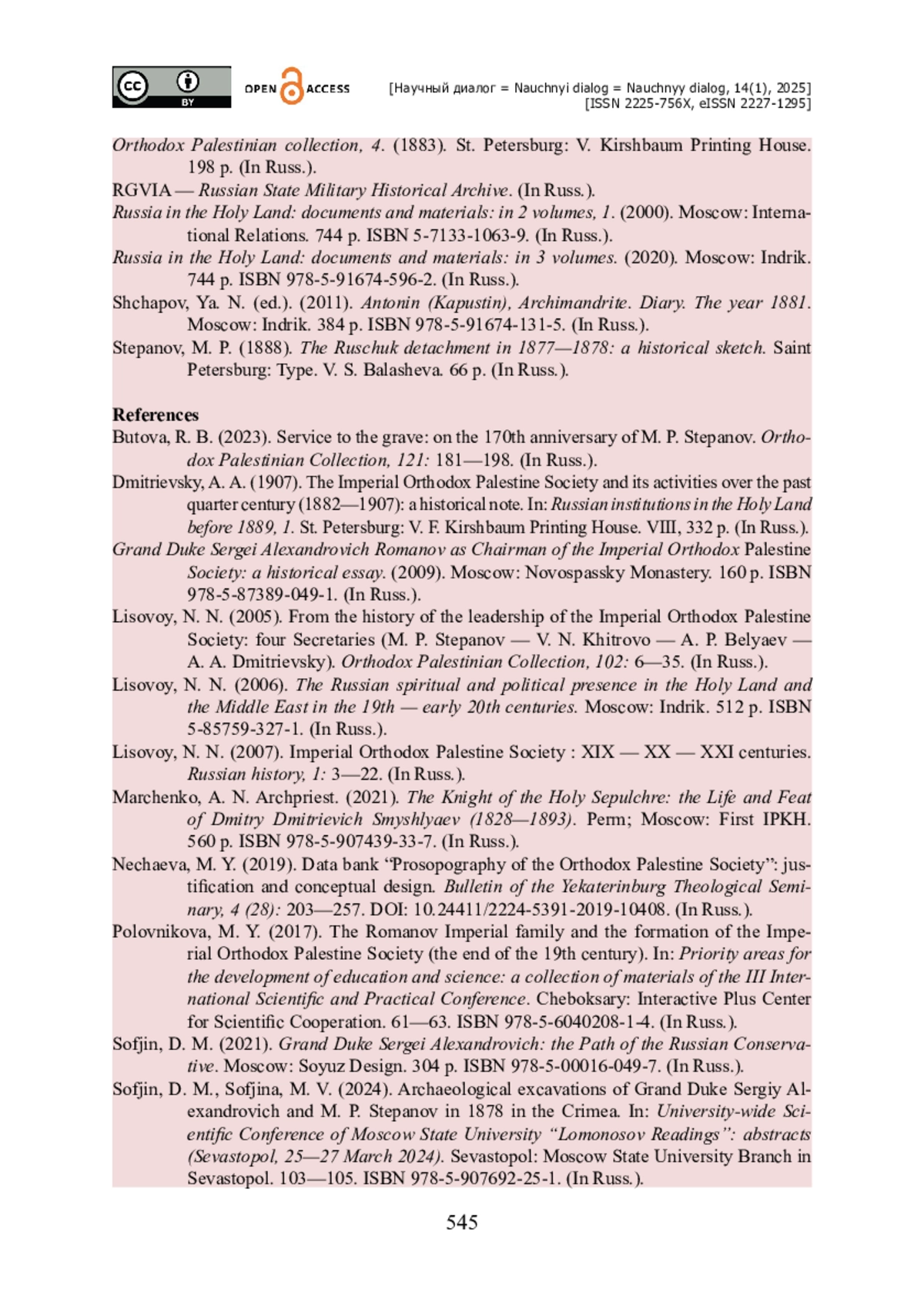22. Лисовой Н. Н. Императорское Православное Палестинское общество : XIX - ХХ - XXI века / Н. Н. Лисовой // Отечественная история. - 2007. - № 1. - С. 3-22.