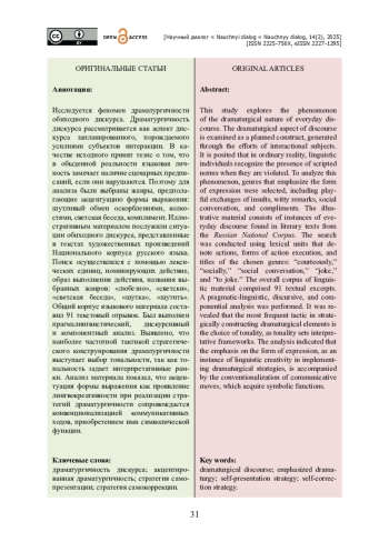 Исследуется феномен драматургичности обиходного дискурса. Драматургичность дискурса рассматривается как аспект дискурса запланированного, порождаемого усилиями субъектов интеракции. В качестве исходного принят тезис о том, что в обыденной реальности языковая личность замечает наличие сценарных предписаний, если они нарушаются. Поэтому для анализа были выбраны жанры, предполагающие акцентуацию формы выражения: шутливый обмен оскорблениями, колкостями, светская беседа, комплимент. Иллюстративным материалом послужили ситуации обиходного дискурса, представленные в текстах художественных произведений Национального корпуса русского языка. Поиск осуществлялся с помощью лексических единиц, номинирующих действие, образ выполнения действия, названия выбранных жанров: «любезно», «светски», «светская беседа», «шутка», «шутить». Общий корпус языкового материала составил 91 текстовый отрывок. Был выполнен прагмалингвистический, дискурсивный и компонентный анализ. Выявлено, что наиболее частотной тактикой стратегического конструирования драматургичности выступает выбор тональности, так как тональность задает интерпретативные рамки. Анализ материала показал, что акцентуация формы выражения как проявление лингвокреативности при реализации стратегий драматургичности сопровождается конвенционализацией коммуникативных ходов, приобретением ими символической функции.