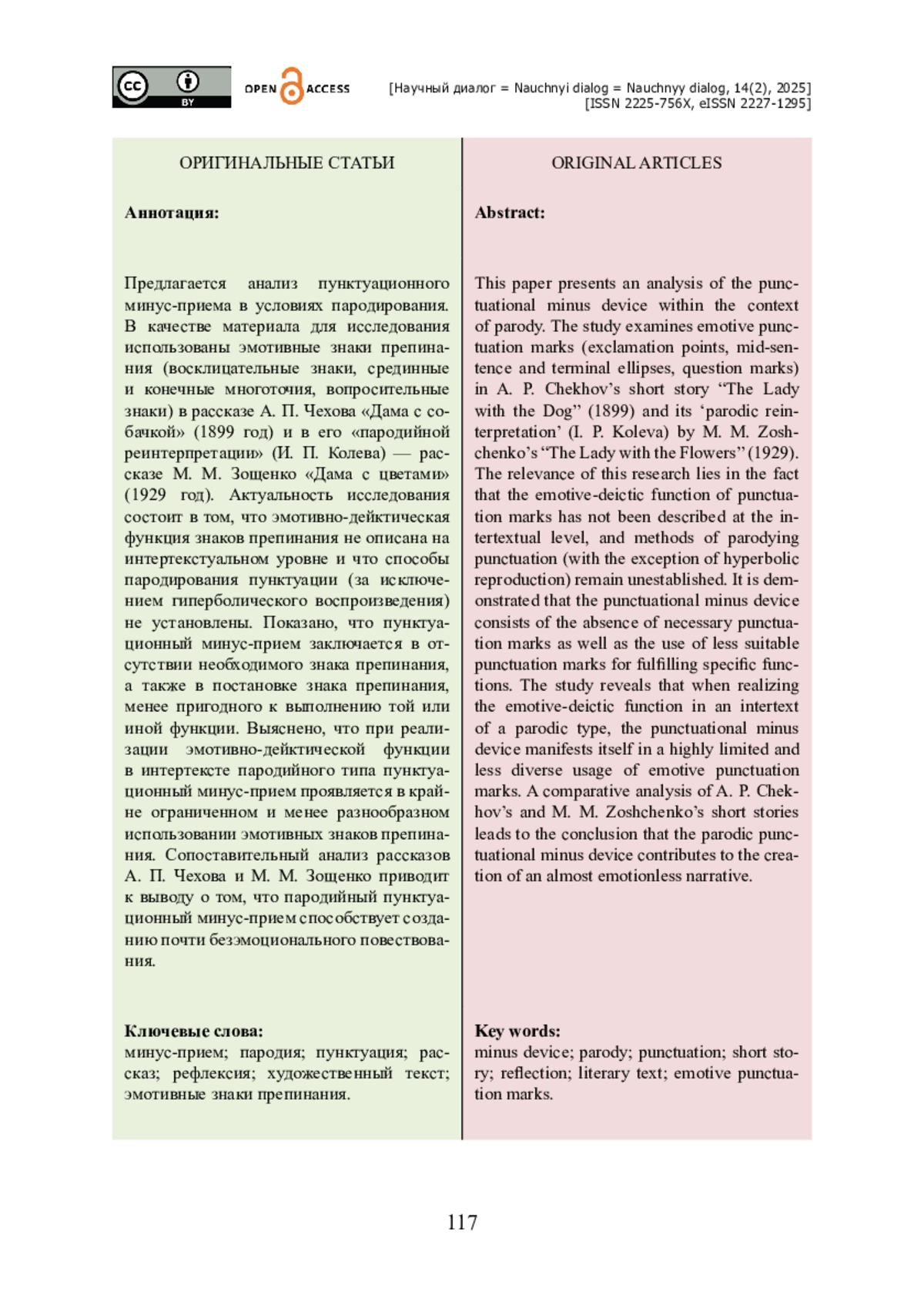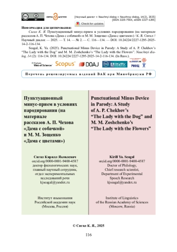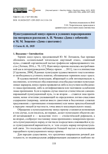 Предлагается анализ пунктуационного минус-приема в условиях пародирования. В качестве материала для исследования использованы эмотивные знаки препинания (восклицательные знаки, срединные и конечные многоточия, вопросительные знаки) в рассказе А. П. Чехова «Дама с собачкой» (1899 год) и в его «пародийной реинтерпретации» (И. П. Колева) — рассказе М. М. Зощенко «Дама с цветами» (1929 год). Актуальность исследования состоит в том, что эмотивно-дейктическая функция знаков препинания не описана на интертекстуальном уровне и что способы пародирования пунктуации (за исключением гиперболического воспроизведения) не установлены. Показано, что пунктуационный минус-прием заключается в отсутствии необходимого знака препинания, а также в постановке знака препинания, менее пригодного к выполнению той или иной функции. Выяснено, что при реализации эмотивно-дейктической функции в интертексте пародийного типа пунктуационный минус-прием проявляется в крайне ограниченном и менее разнообразном использовании эмотивных знаков препинания. Сопоставительный анализ рассказов А. П. Чехова и М. М. Зощенко приводит к выводу о том, что пародийный пунктуационный минус-прием способствует созданию почти безэмоционального повествования.