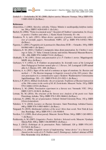 3. Галанова Е. М. Метапоэтические представления А. П. Чехова о пунктуации / Е. М. Галанова // Чеховские чтения в Ялте / Под ред. О. О. Пернацкой. - Ялта : Крымский литературно-художественный мемориальный музей-заповедник, 2021. - Выпуск 25. - С. 198-206. - ISBN 978-5-6046175-8-8.