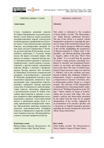 Статья посвящена рецепции новеллы Ф. Кафки «Превращение» в русской мысли. Целью статьи является анализ различных интерпретационных версий относительно наличия крыльев у превратившегося Грегора Замзы. Сопоставлены разные трактовки новеллы, актуализирующие внешний облик героя: русского переводчика Г. Ноткина, русского критика В. Белоножко, русскоязычного драматурга З. Сагалова, автора пьесы «Не верьте господину Кафке». Выявлено, что вопрос о крыльях Грегора имеет противоположное решение в научной и переводческой, с одной стороны, и художественной, с другой стороны, герменевтике новеллы. Вопрос о наличии у превратившегося Грегора крыльев был поставлен В. Набоковым. В научной и переводческой традиции, полемизирующей с трактовкой В. Набокова, превращение Грегора в жука, наделенного крыльями, отвергается. Художественный опыт герменевтики новеллы, наоборот, изображает Грегора крылатым существом. Релевантность такой интерпретации новеллы обоснована обращением к незаконченному роману Ф. Кафки «Свадебные приготовления в деревне», в котором содержится образ превращения в жука, наделенного крыльми. Сопоставительный анализ и наблюдения автора легли в основу оригинальной интерпретации новеллы. Предложенная трактовка подкреплена анализом повествовательной специфики новеллы и обращением к практике английского перевода лексемы, обозначающей насекомое, в которое превратился Грегор.