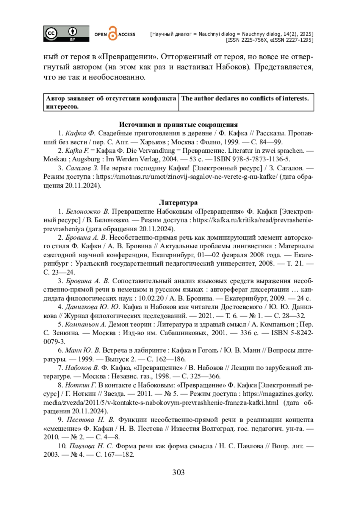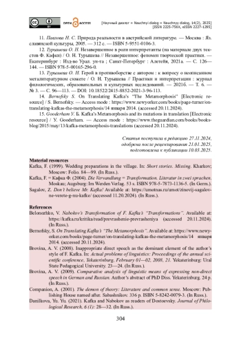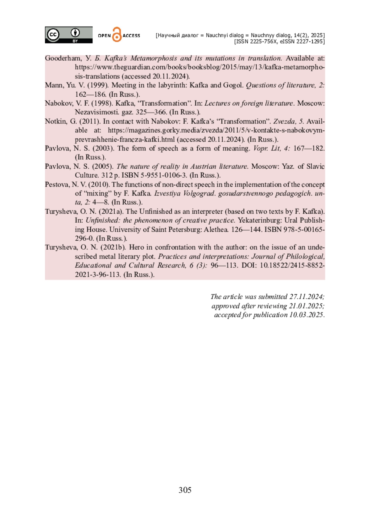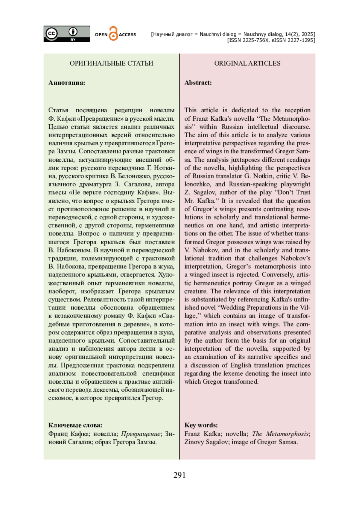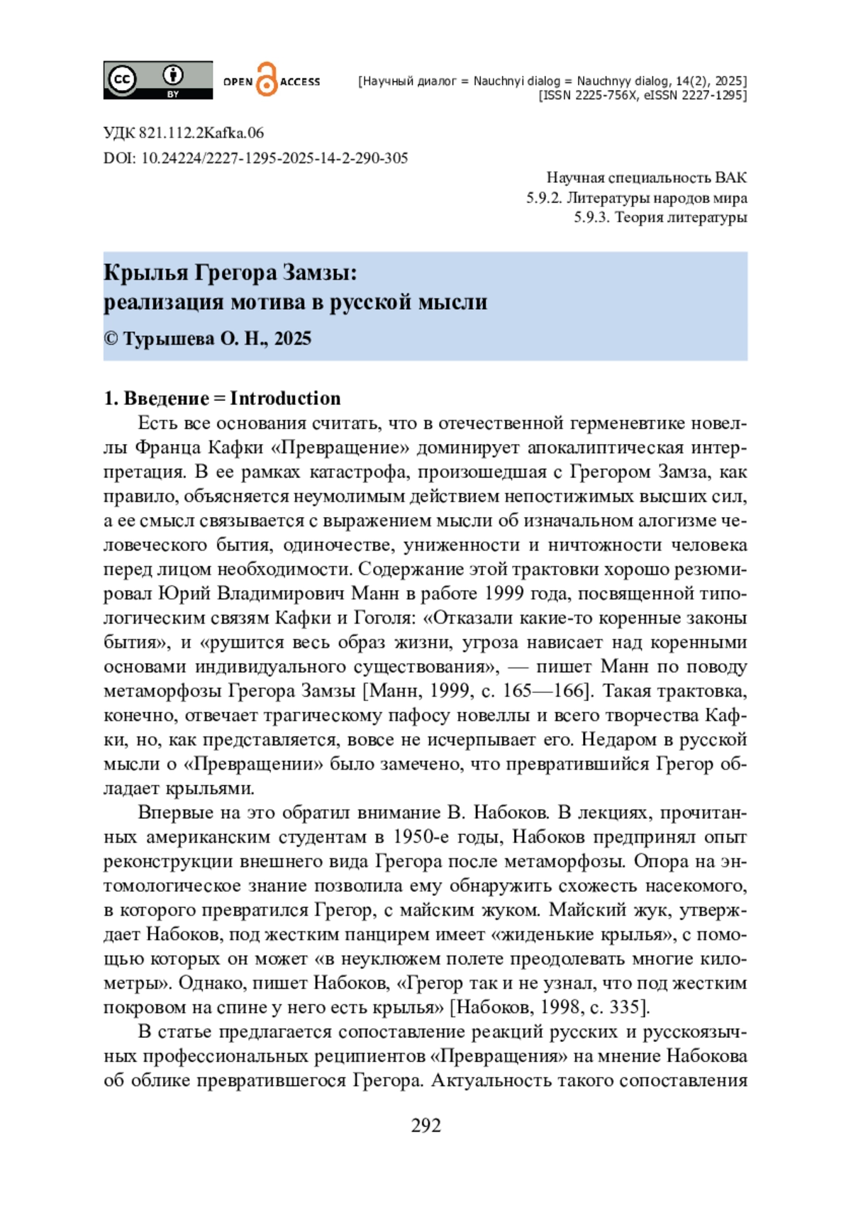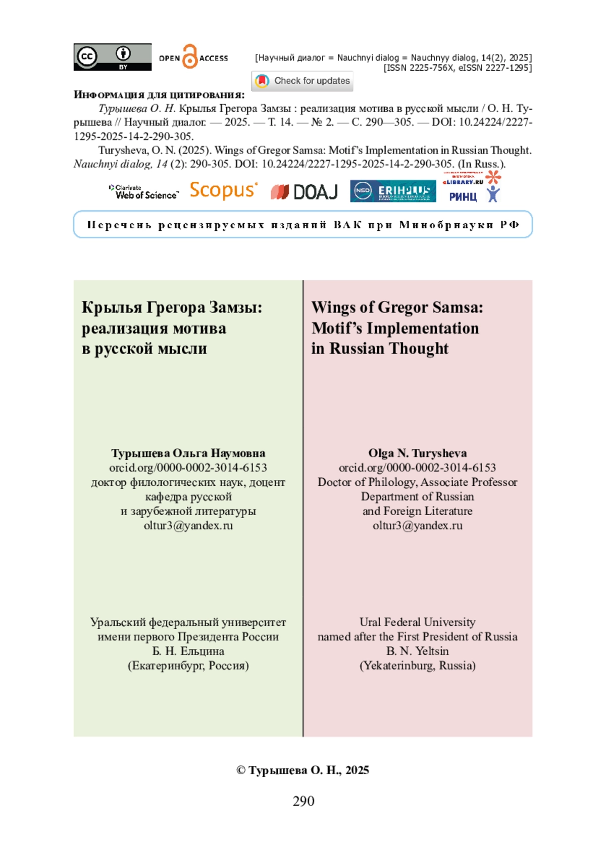 ТУРЫШЕВА О. Н. КРЫЛЬЯ ГРЕГОРА ЗАМЗЫ: РЕАЛИЗАЦИЯ МОТИВА В РУССКОЙ МЫСЛИ // НАУЧНЫЙ ДИАЛОГ. 2025. ТОМ 14, № 2