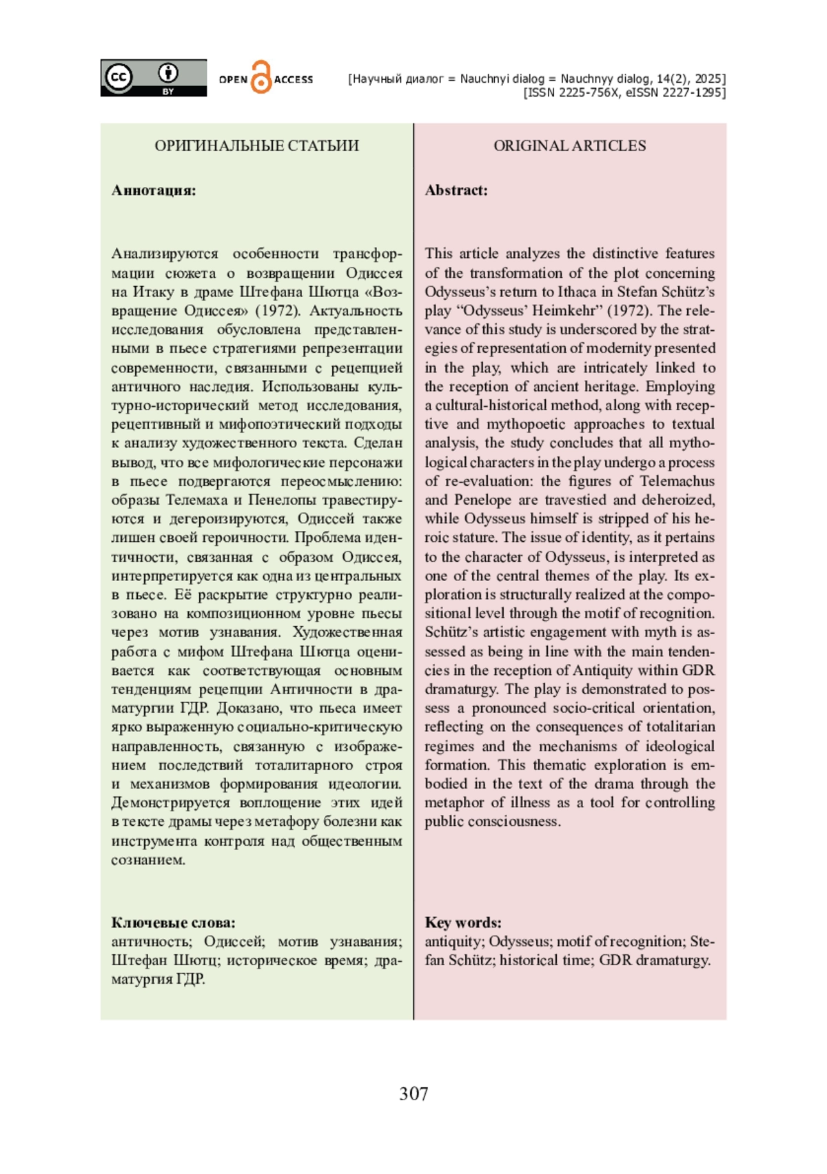 Анализируются особенности трансформации сюжета о возвращении Одиссея на Итаку в драме Штефана Шютца «Возвращение Одиссея» (1972). Актуальность исследования обусловлена представленными в пьесе стратегиями репрезентации современности, связанными с рецепцией античного наследия. Использованы культурно-исторический метод исследования, рецептивный и мифопоэтический подходы к анализу художественного текста. Сделан вывод, что все мифологические персонажи в пьесе подвергаются переосмыслению: образы Телемаха и Пенелопы травестируются и дегероизируются, Одиссей также лишен своей героичности. Проблема идентичности, связанная с образом Одиссея, интерпретируется как одна из центральных в пьесе. Её раскрытие структурно реализовано на композиционном уровне пьесы через мотив узнавания. Художественная работа с мифом Штефана Шютца оценивается как соответствующая основным тенденциям рецепции Античности в драматургии ГДР. Доказано, что пьеса имеет ярко выраженную социально-критическую направленность, связанную с изображением последствий тоталитарного строя и механизмов формирования идеологии. Демонстрируется воплощение этих идей в тексте драмы через метафору болезни как инструмента контроля над общественным сознанием.