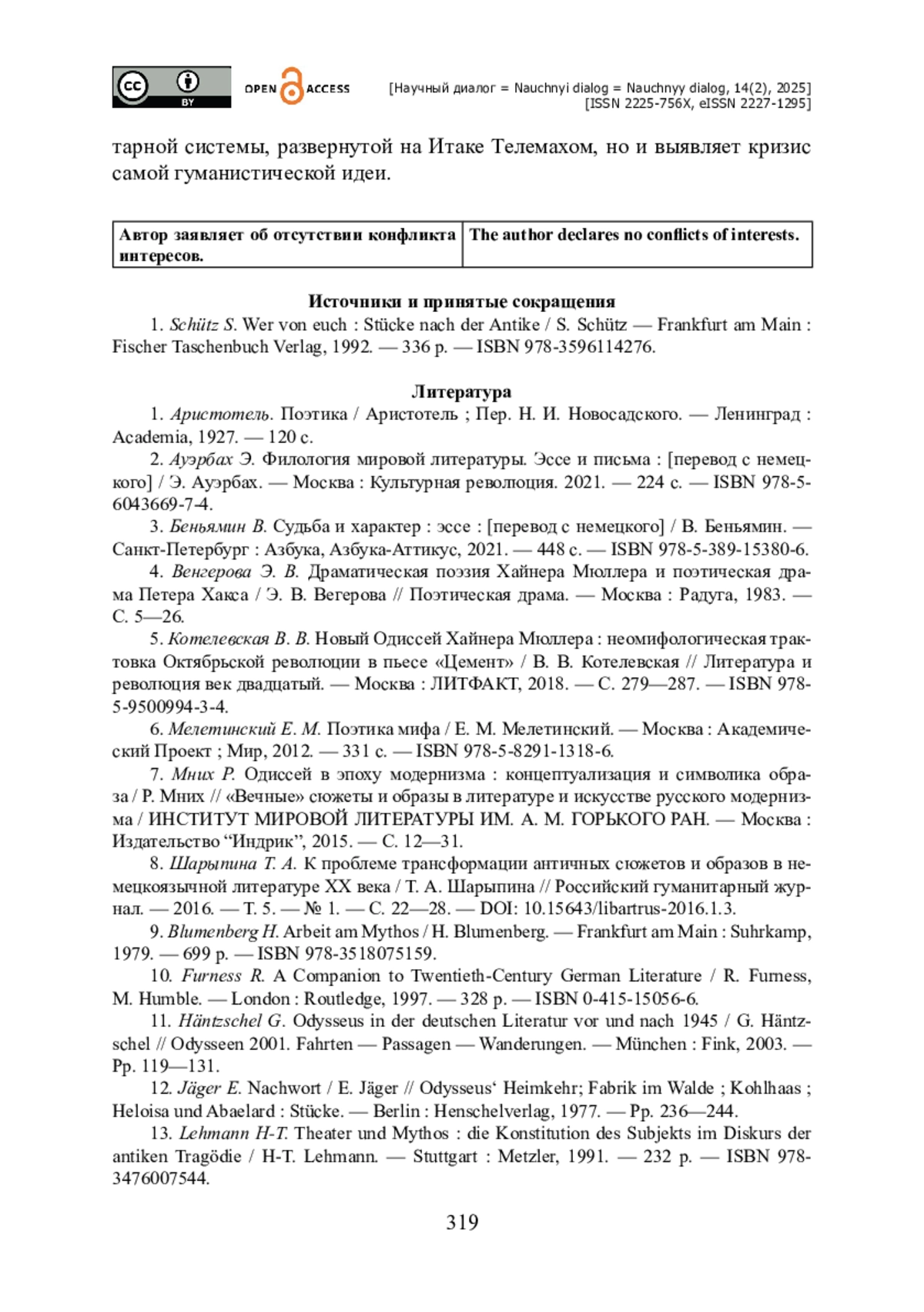 8. Шарыпина Т. А. К проблеме трансформации античных сюжетов и образов в немецкоязычной литературе XX века / Т. А. Шарыпина // Российский гуманитарный журнал. - 2016. - Т. 5. - № 1. - С. 22-28. - https://doi.org/10.15643/libartrus-2016.1.3.