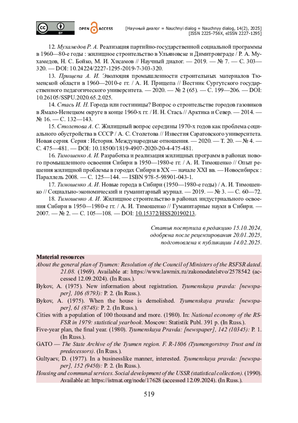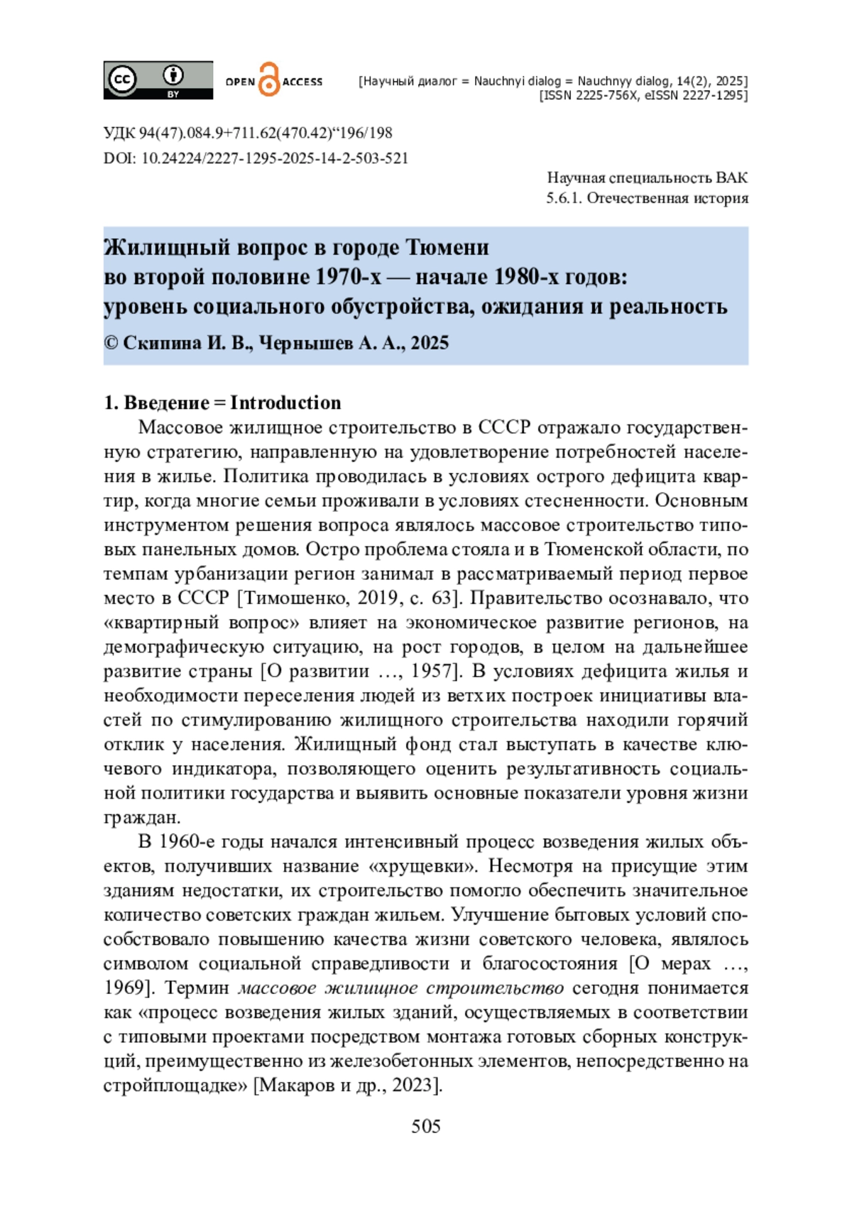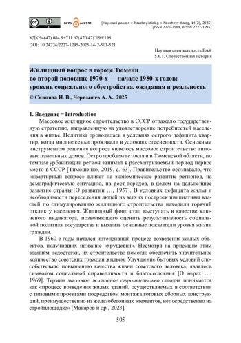 СКИПИНА И. В., ЧЕРНЫШЕВ А. А. ЖИЛИЩНЫЙ ВОПРОС В ГОРОДЕ ТЮМЕНИ ВО ВТОРОЙ ПОЛОВИНЕ 1970-Х — НАЧАЛЕ 1980-Х ГОДОВ: УРОВЕНЬ СОЦИАЛЬНОГО ОБУСТРОЙСТВА, ОЖИДАНИЯ И РЕАЛЬНОСТЬ // НАУЧНЫЙ ДИАЛОГ. 2025. ТОМ 14, № 2