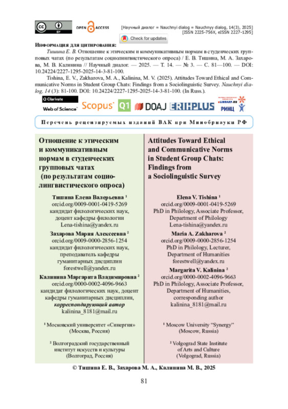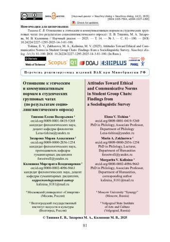 Цель статьи — проанализировать особенности трансформации этических и коммуникативных норм в жанре группового студенческого чата. Эмпирическую базу исследования составили данные социолингвистического опроса, проведённого в ноябре-декабре 2024 года с помощью Google Forms и состоящего из 5 разделов и 30 вопросов. В опросе приняли участие 95 студентов творческих специальностей двух возрастных групп: 1) от 17 лет до 21 года (89,47 %); 2) 22 года и старше (10,53 %). Предметом исследования в статье являются материалы двух начальных разделов опросника, характеризующие отношение респондентов к этическим и коммуникативным нормам русского языка. По результатам исследования сделан вывод о том, что в современной чат-коммуникации прослеживается ряд новых тенденций, в частности, нейтральное и положительное отношение к отсутствию приветствия и фразам «Заранее спасибо», «Я Вас услышал(а)». Выявлено, что ведущей коммуникативно-этической ценностью остаётся вежливость к адресату, при этом не все респонденты различают нейтральный (искренняя вежливость) и иронический (нарочитая вежливость) подтексты, что может приводить к коммуникативным неудачам. Отмечено, что в студенческом сообществе стремление соблюдать нормы письменной речи зависит от степени официальности беседы. Выявлена тенденция к разграничению делового и личного коммуникативного пространства.