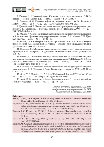 8. Лукинова О. В. Языковая рефлексия: цифровой этикет / О. В. Лукинова // МИРС. - 2023. - № 3. - С. 22-29. - https://doi.org/10.21638/spbu30.2023.303.