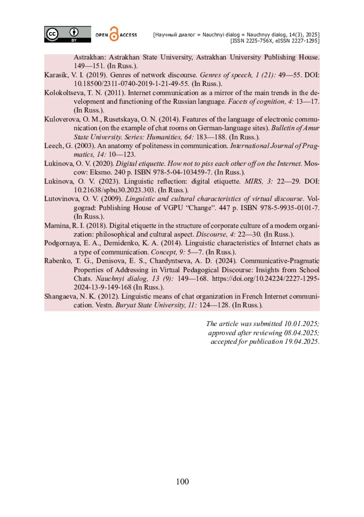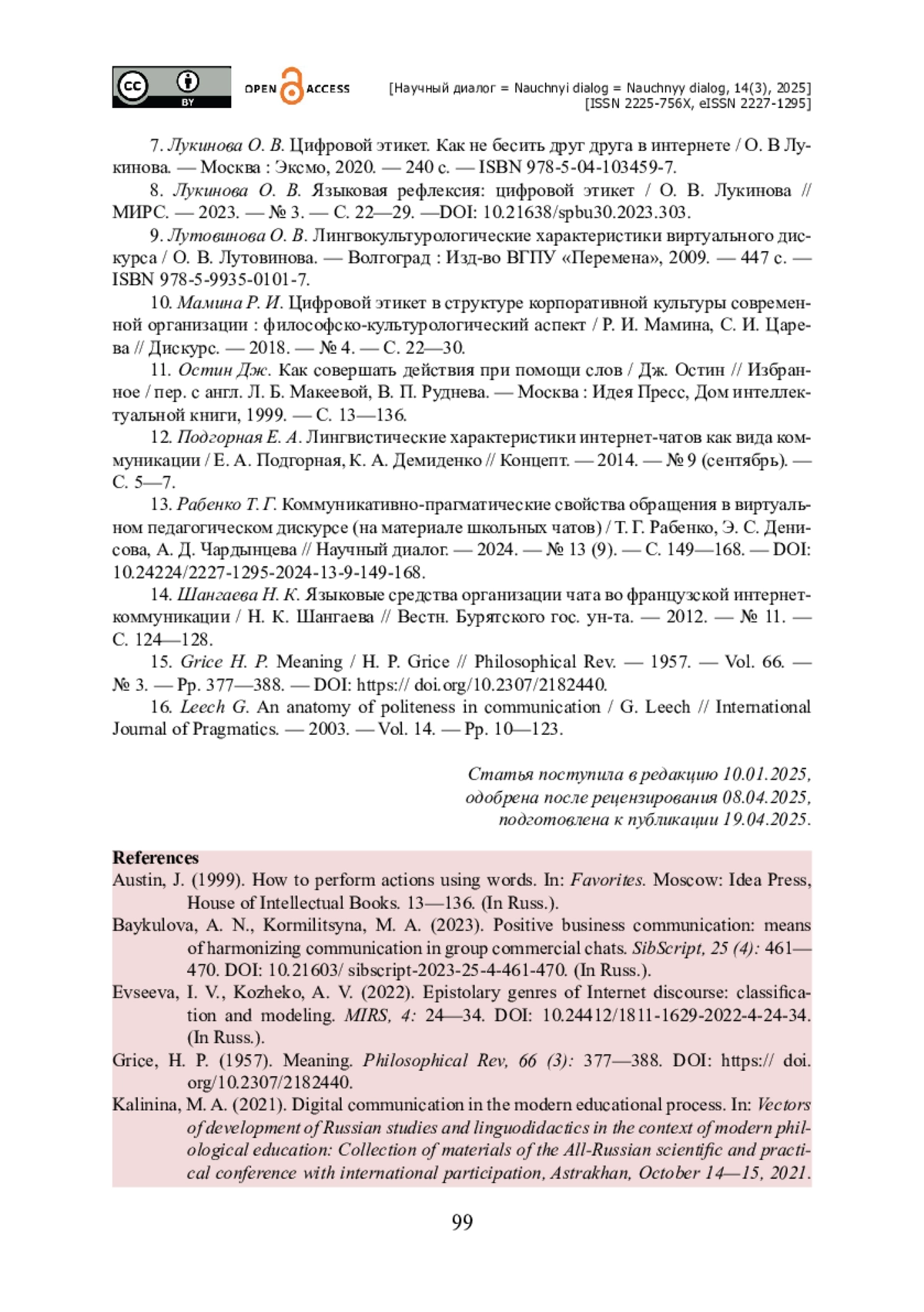 13. Рабенко Т. Г. Коммуникативно-прагматические свойства обращения в виртуальном педагогическом дискурсе (на материале школьных чатов) / Т. Г. Рабенко, Э. С. Денисова, А. Д. Чардынцева // Научный диалог. - 2024. - № 13 (9). - С. 149-168. - https://doi.org/10.24224/2227-1295-2024-13-9-149-168.