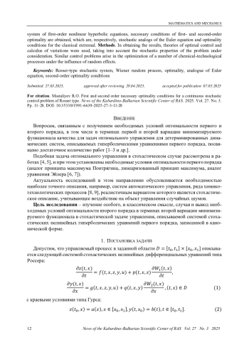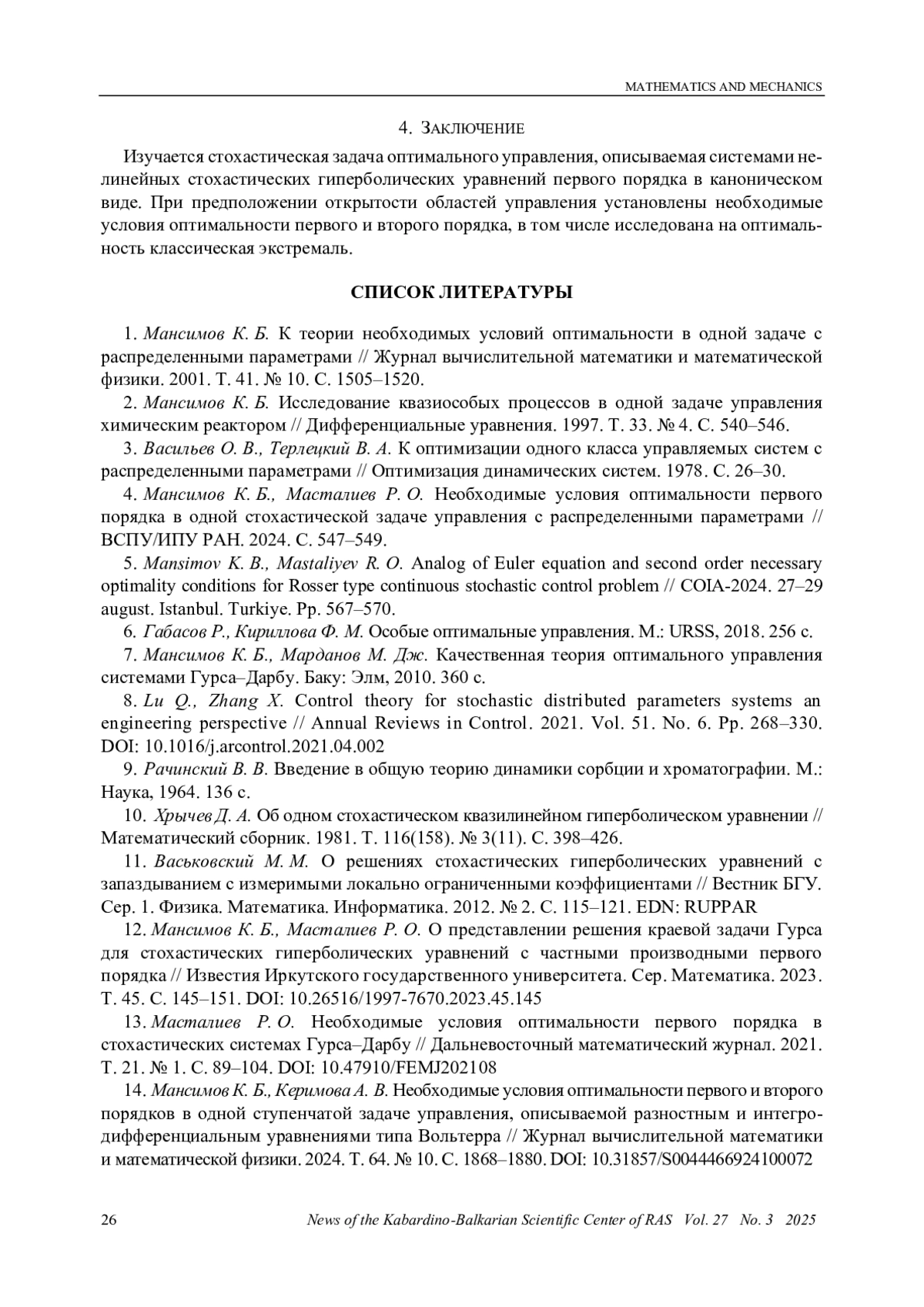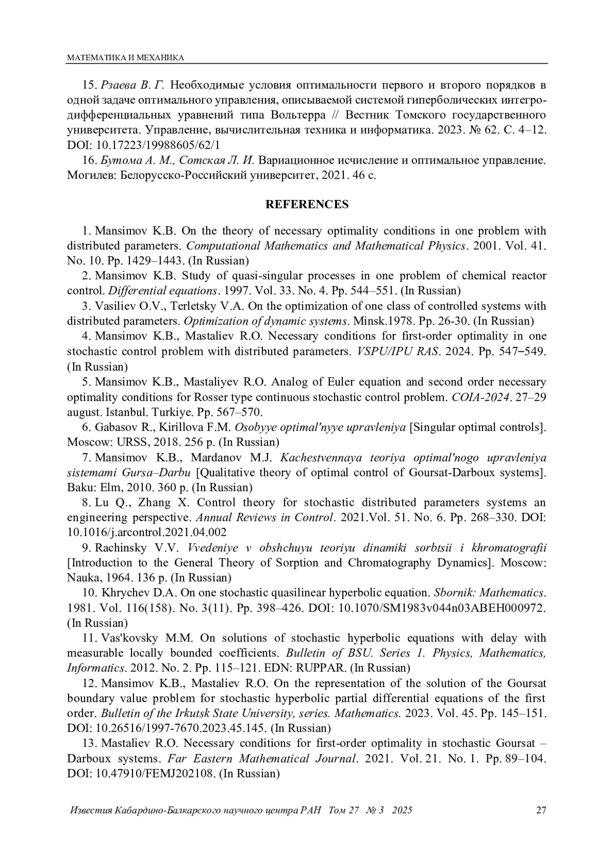 13. Масталиев Р. О. Необходимые условия оптимальности первого порядка в стохастических системах Гурса-Дарбу // Дальневосточный математический журнал. 2021. Т. 21. № 1. С. 89-104. DOI: 10.47910/FEMJ202108 EDN: BNCCSH
