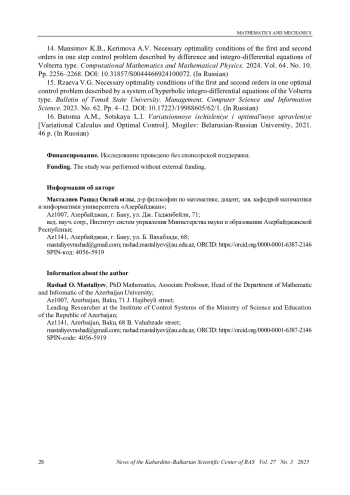 14. Мансимов К. Б., Керимова А. В. Необходимые условия оптимальности первого и второго порядков в одной ступенчатой задаче управления, описываемой разностным и интегродифференциальным уравнениями типа Вольтерра // Журнал вычислительной математики и математической физики. 2024. Т. 64. № 10. С. 1868-1880. DOI: 10.31857/S0044466924100072 EDN: KADJTN