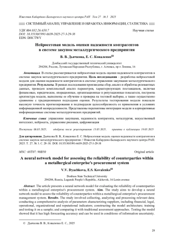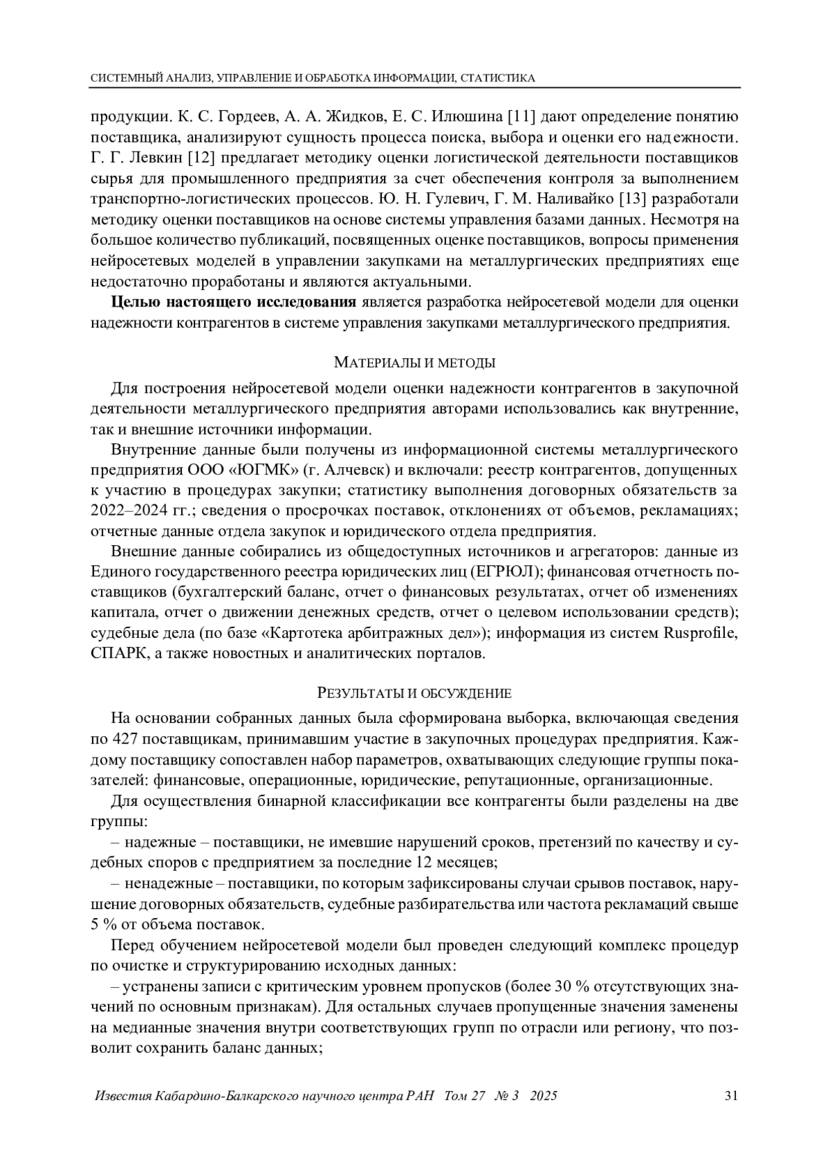Результаты. В рамках исследования произведены сбор, анализ и обработка релевантных данных, проведен комплексный анализ параметров, характеризующих поставщиков, включая финансовые, юридические, операционные, организационные и репутационные показатели, построена архитектура модели, выполнены ее обучение и проверка на тестовой выборке, а также осуществлено сравнение с традиционными подходами оценки. Результаты тестирования модели показали высокую точность прогнозирования и подтвердили целесообразность ее применения в условиях информационной неопределенности. Представлены перспективы интеграции модели в корпоративные информационные системы металлургических предприятий.