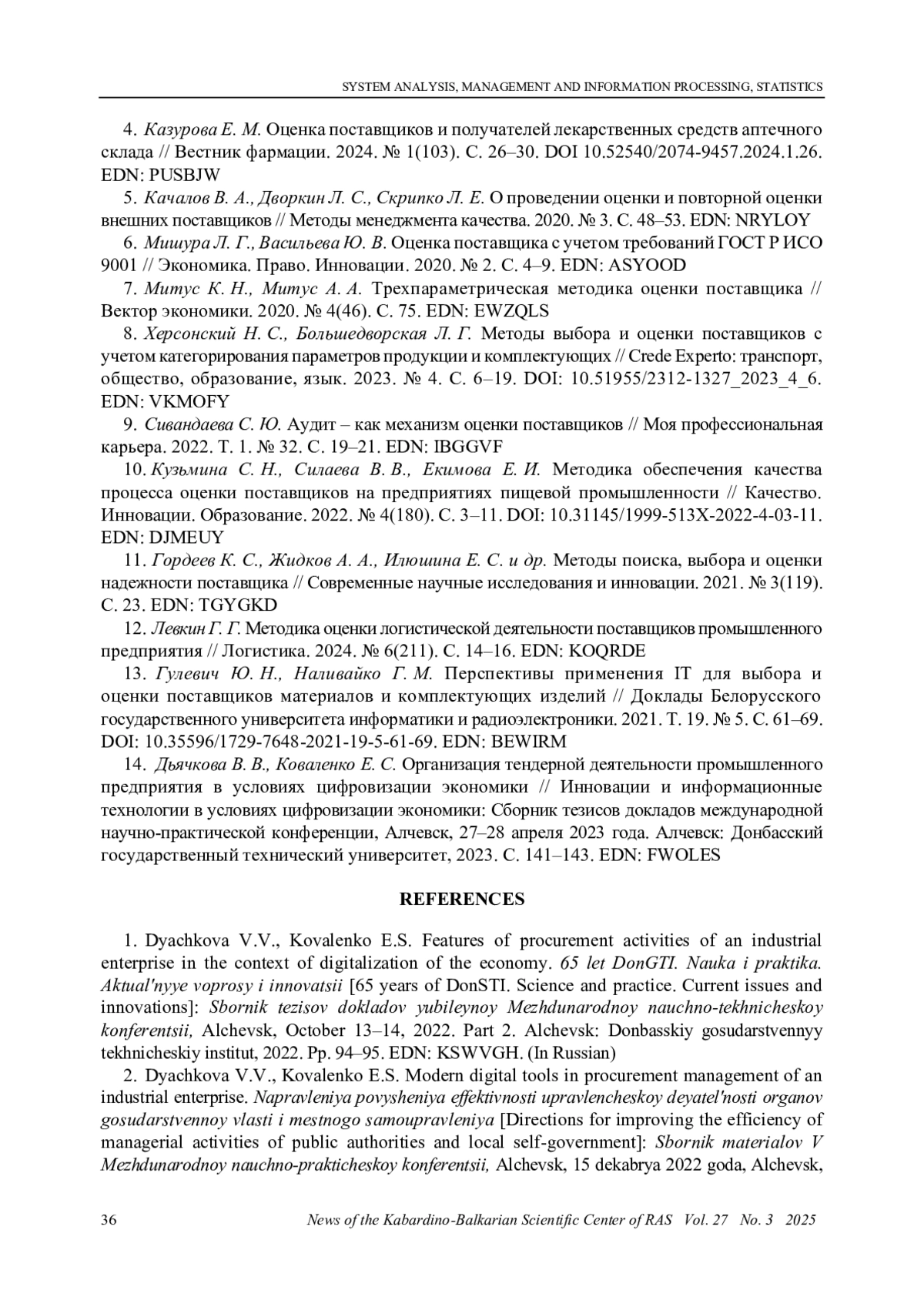 1. Дьячкова В. В., Коваленко Е. С. Особенности закупочной деятельности промышленного предприятия в условиях цифровизации экономики // 65 лет ДонГТИ. Наука и практика. Актуальные вопросы и инновации: Сборник тезисов докладов юбилейной Международной научно-технической конференции, Алчевск, 13-14 октября 2022 года. Часть 2. Алчевск: Донбасский государственный технический институт, 2022. С. 94-95. EDN: KSWVGH
