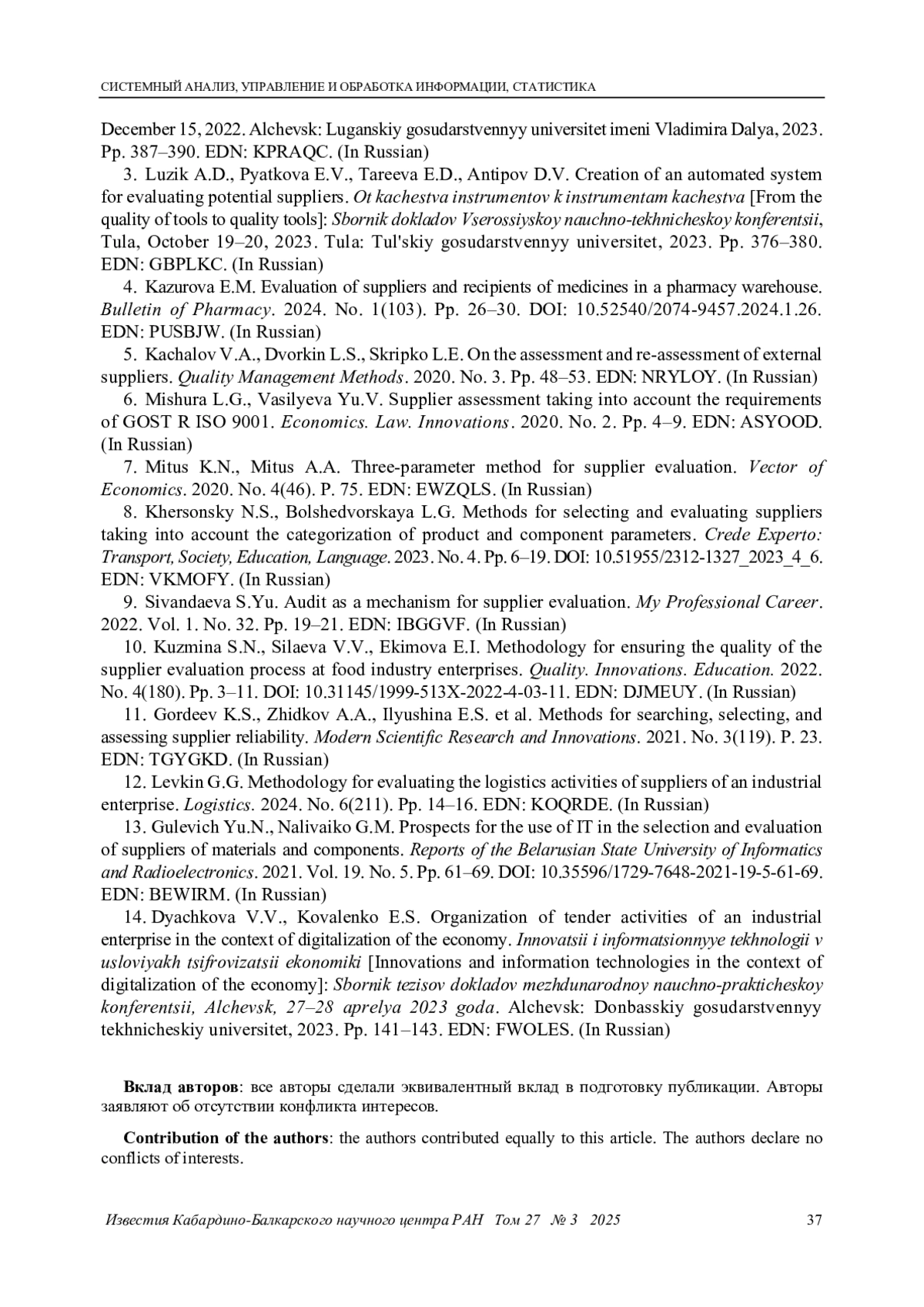 13. Гулевич Ю. Н., Наливайко Г. М. Перспективы применения IT для выбора и оценки поставщиков материалов и комплектующих изделий // Доклады Белорусского государственного университета информатики и радиоэлектроники. 2021. Т. 19. № 5. С. 61-69. DOI: 10.35596/1729-7648-2021-19-5-61-69 EDN: BEWIRM