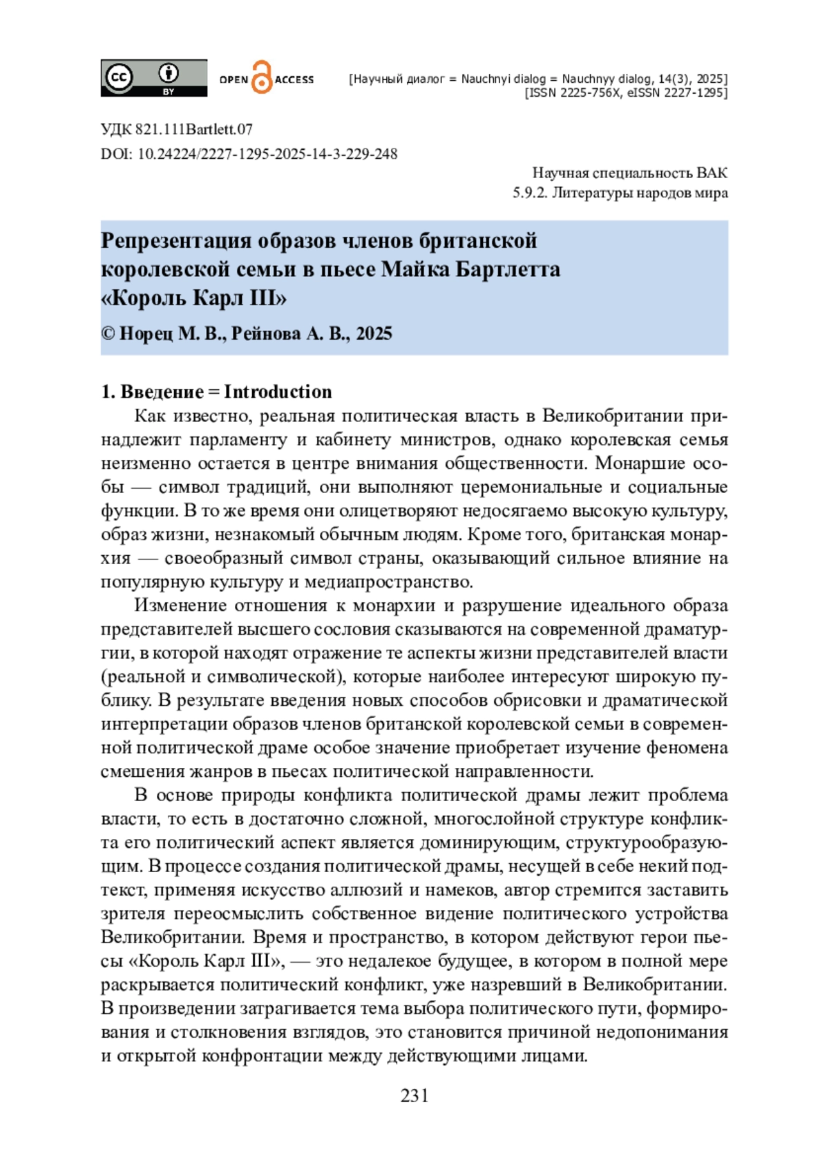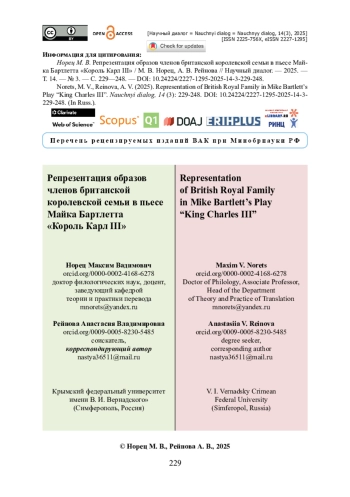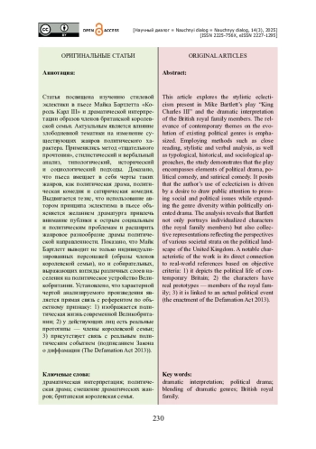 Статья посвящена изучению стилевой эклектики в пьесе Майка Бартлетта «Король Карл III» и драматической интерпретации образов членов британской королевской семьи. Актуальным является влияние злободневной тематики на изменение существующих жанров политического характера. Применялись метод «тщательного прочтения», стилистический и вербальный анализ, типологический, исторический и социологический подходы. Доказано, что пьеса вмещает в себя черты таких жанров, как политическая драма, политическая комедия и сатирическая комедия. Выдвигается тезис, что использование автором принципа эклектизма в пьесе объясняется желанием драматурга привлечь внимание публики к острым социальным и политическим проблемам и расширить жанровое разнообразие драмы политической направленности. Показано, что Майк Бартлетт выводит не только индивидуализированных персонажей (образы членов королевской семьи), но и собирательных, выражающих взгляды различных слоев населения на политическое устройство Великобритании. Установлено, что характерной чертой анализируемого произведения является прямая связь с референтом по объектному признаку: 1) изображается политическая жизнь современной Великобритании; 2) у действующих лиц есть реальные прототипы — члены королевской семьи; 3) присутствует связь с реальным политическим событием (подписанием Закона о диффамации (The Defamation Act 2013)).