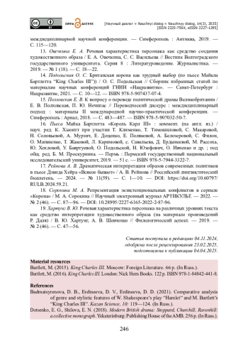 4. Ефремова Г. А. Характеристика речевого поведения членов королевской семи через выразительные средства в пьесе Майка Бартлетта “King Charles III” / Г. А. Ефремова, В. А. Золотова // Наука и образование сегодня. - 2019. - № 6-2 (41). - С. 83-86.
