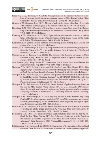 11. Нечипас П. Ю. Стилевая эклектика в пьесе Майка Бартлетта «Король Карл III» / П. Ю. Нечипас // Иностранная филология. Социальная и национальная вариативность языка и литературы : Материалы IV Международного научного конгресса, Симферополь : Ариал, 2019. - С. 461-464.