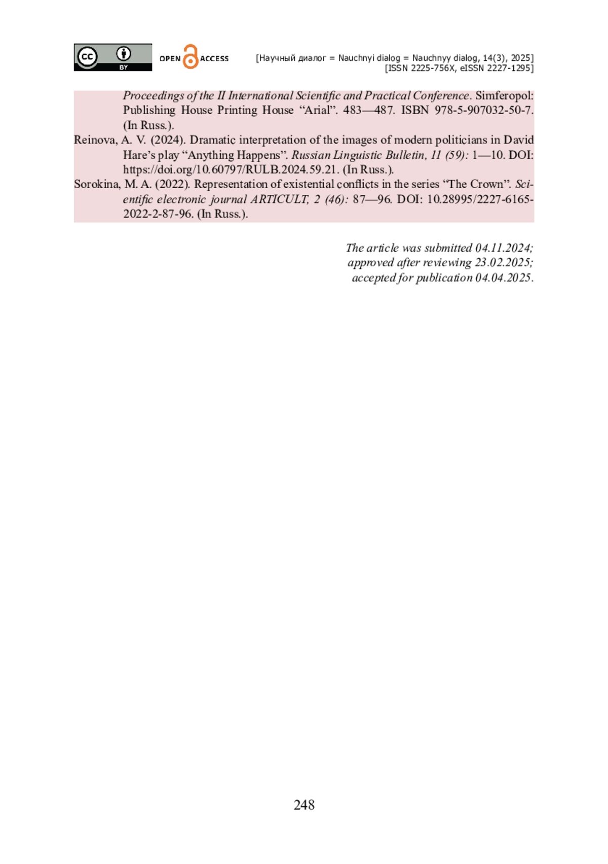 18. Сорокина М. А. Репрезентация экзистенциональных конфликтов в сериале «Корона» / М. А. Сорокина // Научный электронный журнал АРТИКУЛЬТ. - 2022. - № 2 (46). - С. 87-96. - https://doi.org/10.28995/2227-6165-2022-2-87-96.