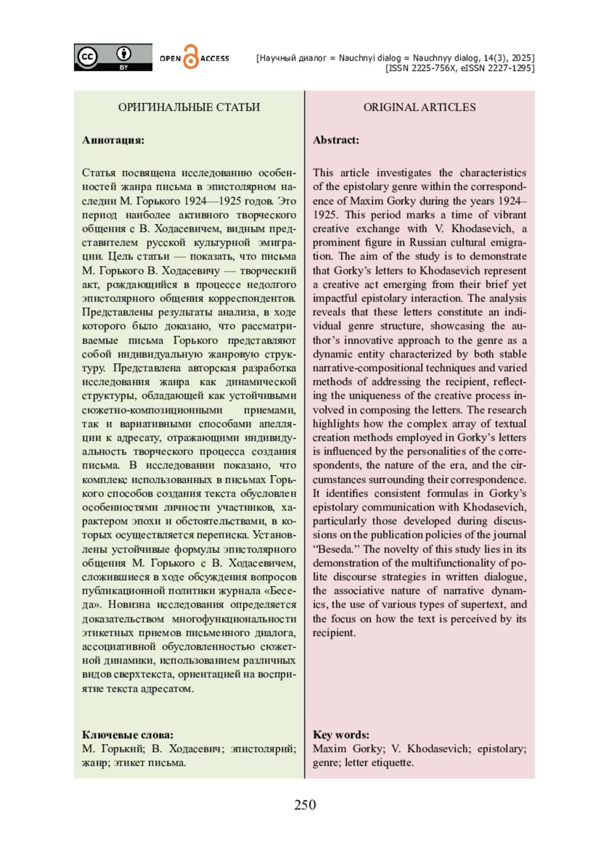 Статья посвящена исследованию особенностей жанра письма в эпистолярном наследии М. Горького 1924—1925 годов. Это период наиболее активного творческого общения с В. Ходасевичем, видным представителем русской культурной эмиграции. Цель статьи — показать, что письма М. Горького В. Ходасевичу — творческий акт, рождающийся в процессе недолгого эпистолярного общения корреспондентов. Представлены результаты анализа, в ходе которого было доказано, что рассматриваемые письма Горького представляют собой индивидуальную жанровую структуру. Представлена авторская разработка исследования жанра как динамической структуры, обладающей как устойчивыми сюжетно-композиционными приемами, так и вариативными способами апелляции к адресату, отражающими индивидуальность творческого процесса создания письма. В исследовании показано, что комплекс использованных в письмах Горького способов создания текста обусловлен особенностями личности участников, характером эпохи и обстоятельствами, в которых осуществляется переписка. Установлены устойчивые формулы эпистолярного общения М. Горького с В. Ходасевичем, сложившиеся в ходе обсуждения вопросов публикационной политики журнала «Беседа». Новизна исследования определяется доказательством многофункциональности этикетных приемов письменного диалога, ассоциативной обусловленностью сюжетной динамики, использованием различных видов сверхтекста, ориентацией на восприятие текста адресатом.