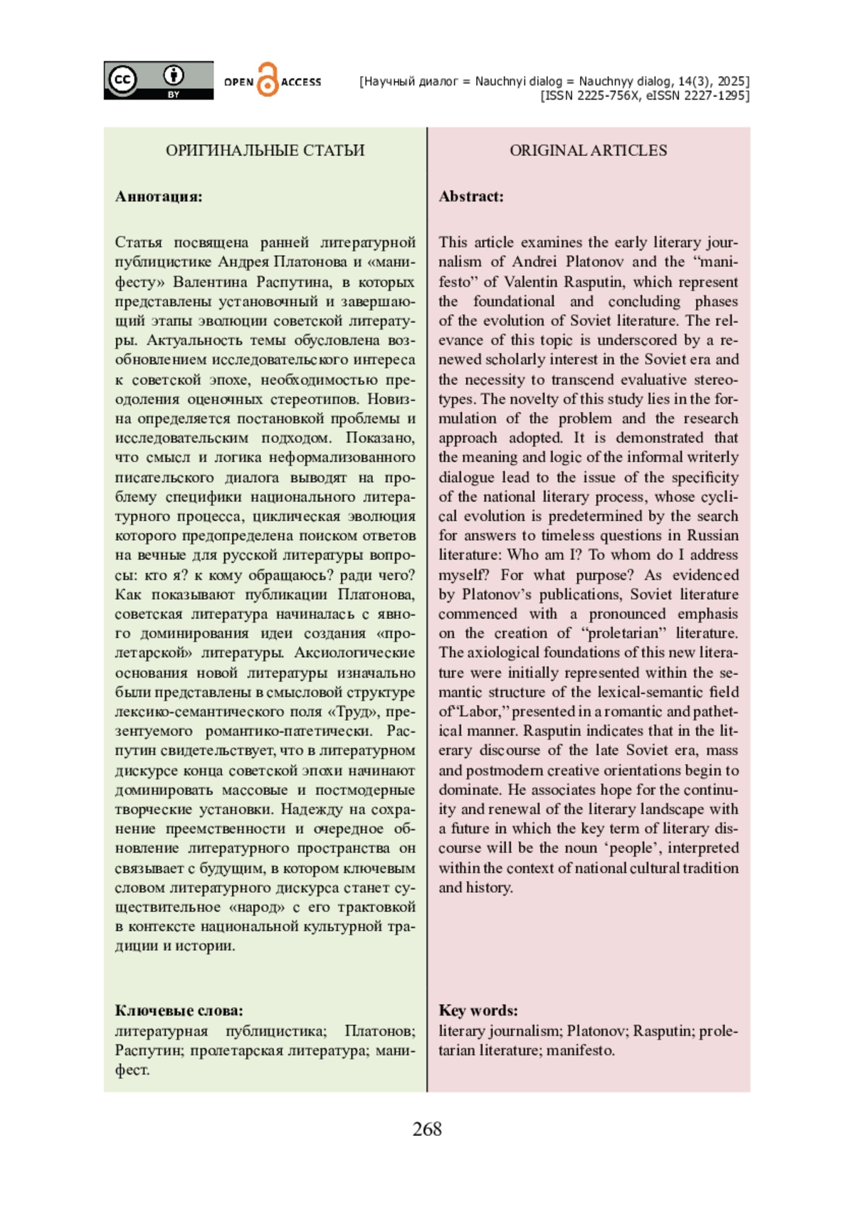 Статья посвящена ранней литературной публицистике Андрея Платонова и «манифесту» Валентина Распутина, в которых представлены установочный и завершающий этапы эволюции советской литературы. Актуальность темы обусловлена возобновлением исследовательского интереса к советской эпохе, необходимостью преодоления оценочных стереотипов. Новизна определяется постановкой проблемы и исследовательским подходом. Показано, что смысл и логика неформализованного писательского диалога выводят на проблему специфики национального литературного процесса, циклическая эволюция которого предопределена поиском ответов на вечные для русской литературы вопросы: кто я? к кому обращаюсь? ради чего? Как показывают публикации Платонова, советская литература начиналась с явного доминирования идеи создания «пролетарской» литературы. Аксиологические основания новой литературы изначально были представлены в смысловой структуре лексико-семантического поля «Труд», презентуемого романтико-патетически. Распутин свидетельствует, что в литературном дискурсе конца советской эпохи начинают доминировать массовые и постмодерные творческие установки. Надежду на сохранение преемственности и очередное обновление литературного пространства он связывает с будущим, в котором ключевым словом литературного дискурса станет существительное «народ» с его трактовкой в контексте национальной культурной традиции и истории.
