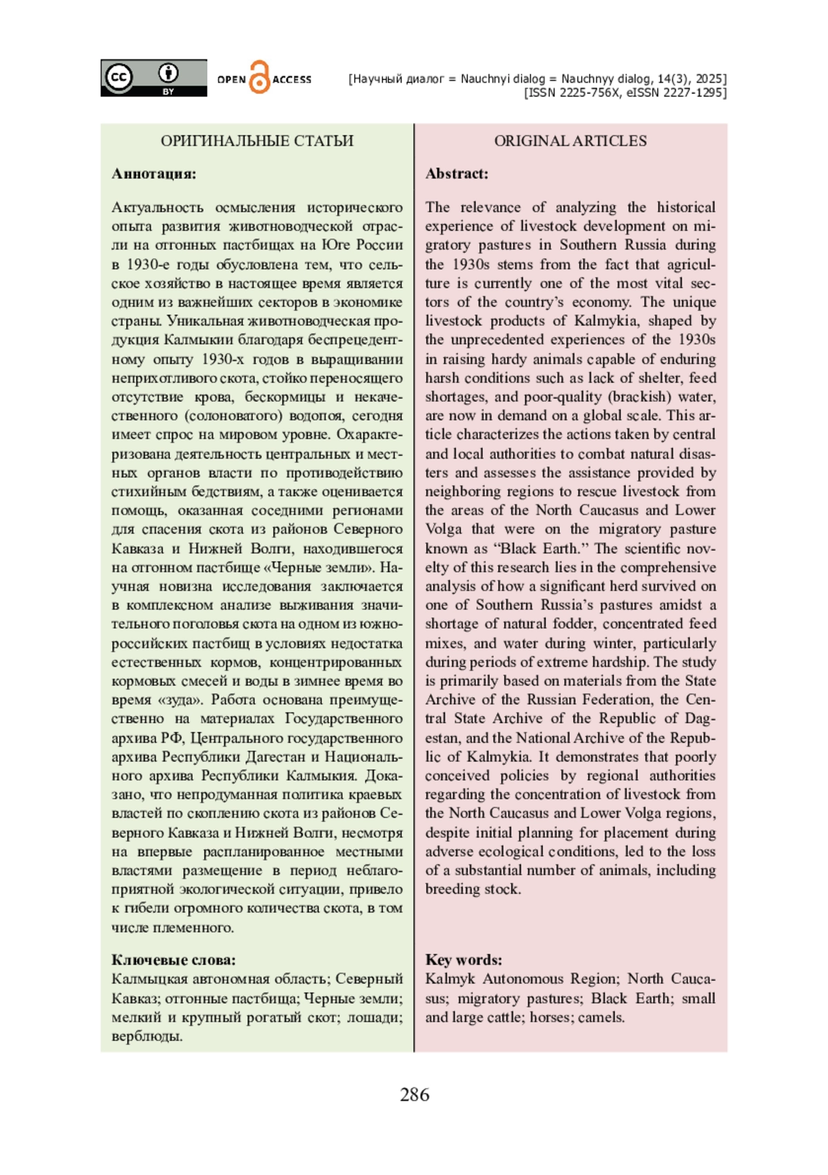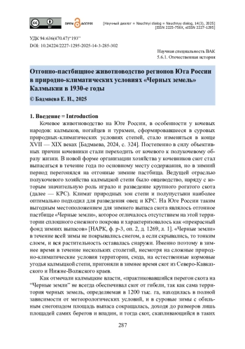 Актуальность осмысления исторического опыта развития животноводческой отрасли на отгонных пастбищах на Юге России в 1930-е годы обусловлена тем, что сельское хозяйство в настоящее время является одним из важнейших секторов в экономике страны. Уникальная животноводческая продукция Калмыкии благодаря беспрецедентному опыту 1930-х годов в выращивании неприхотливого скота, стойко переносящего отсутствие крова, бескормицы и некачественного (солоноватого) водопоя, сегодня имеет спрос на мировом уровне. Охарактеризована деятельность центральных и местных органов власти по противодействию стихийным бедствиям, а также оценивается помощь, оказанная соседними регионами для спасения скота из районов Северного Кавказа и Нижней Волги, находившегося на отгонном пастбище «Черные земли». Научная новизна исследования заключается в комплексном анализе выживания значительного поголовья скота на одном из южнороссийских пастбищ в условиях недостатка естественных кормов, концентрированных кормовых смесей и воды в зимнее время во время «зуда». Работа основана преимущественно на материалах Государственного архива РФ, Центрального государственного архива Республики Дагестан и Национального архива Республики Калмыкия. Доказано, что непродуманная политика краевых властей по скоплению скота из районов Северного Кавказа и Нижней Волги, несмотря на впервые распланированное местными властями размещение в период неблагоприятной экологической ситуации, привело к гибели огромного количества скота, в том числе племенного.