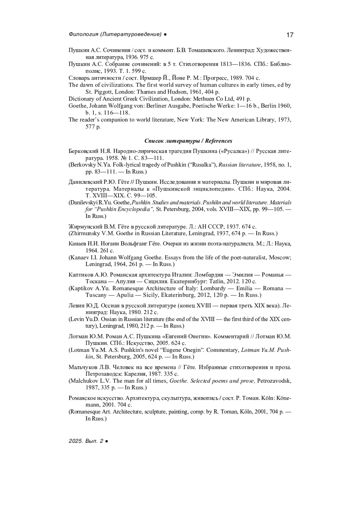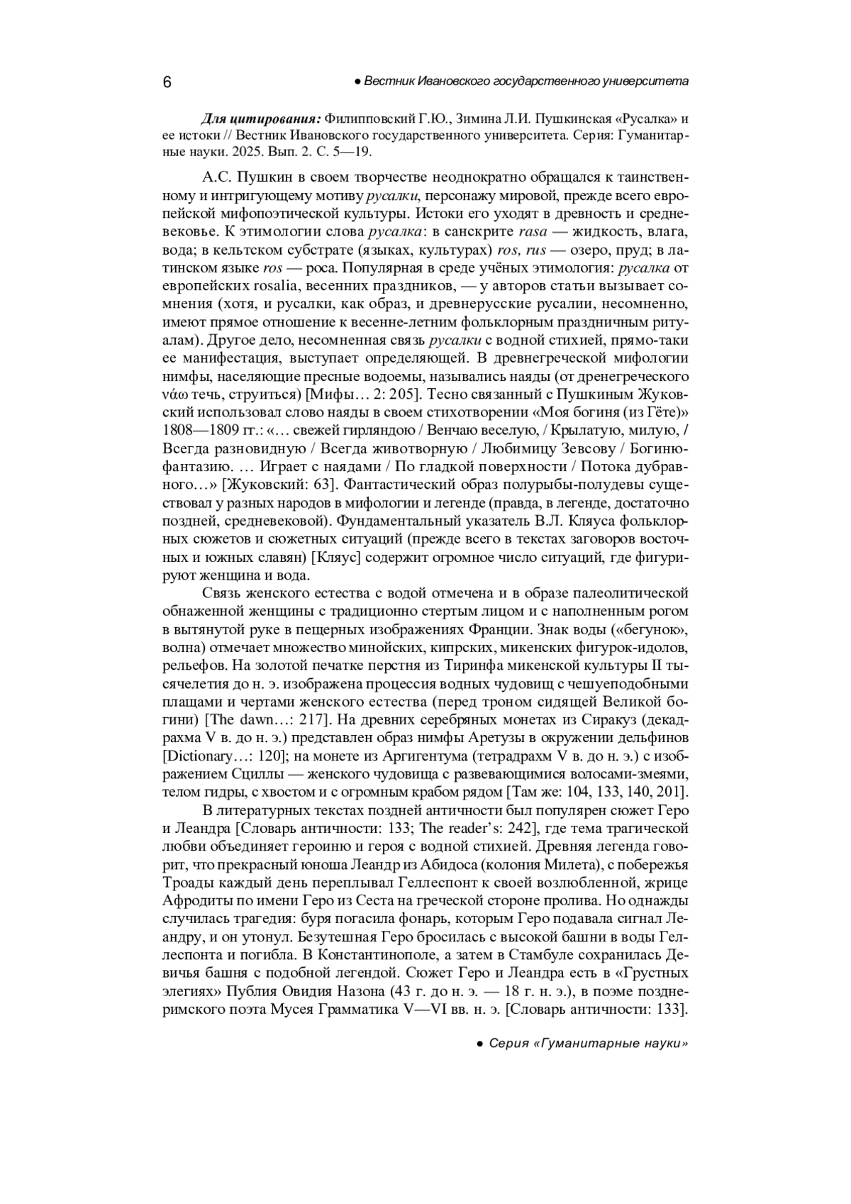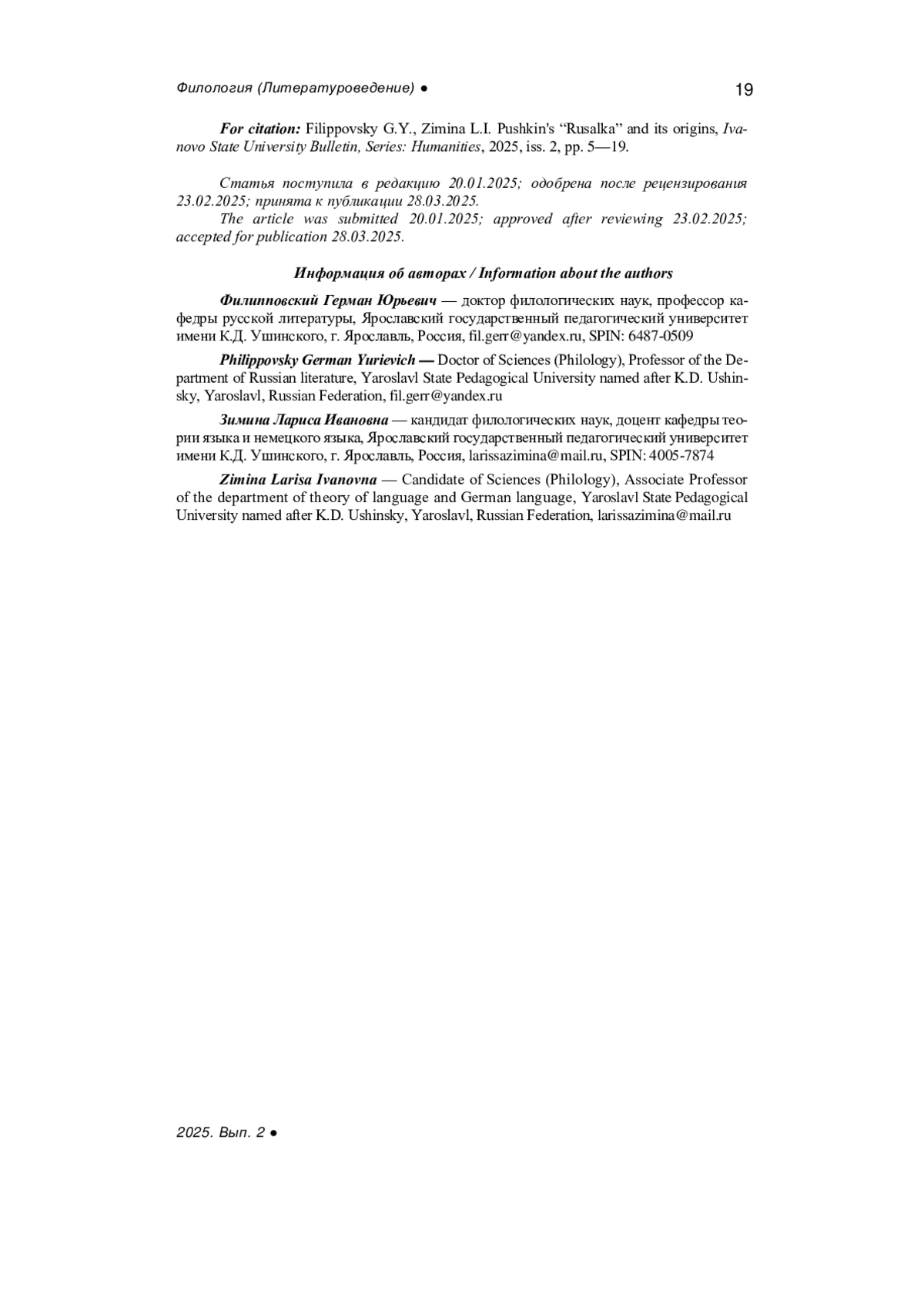 ФИЛИППОВСКИЙ Г. Ю., ЗИМИНА Л. И. ПУШКИНСКАЯ «РУСАЛКА» И ЕЕ ИСТОКИ // ВЕСТНИК ИВАНОВСКОГО ГОСУДАРСТВЕННОГО УНИВЕРСИТЕТА. СЕРИЯ: ГУМАНИТАРНЫЕ НАУКИ. 2025. № 2