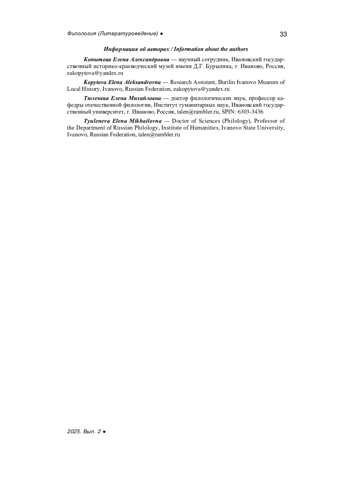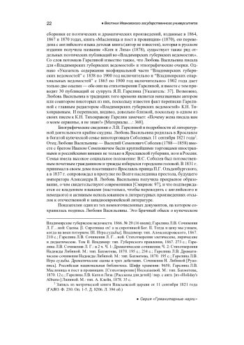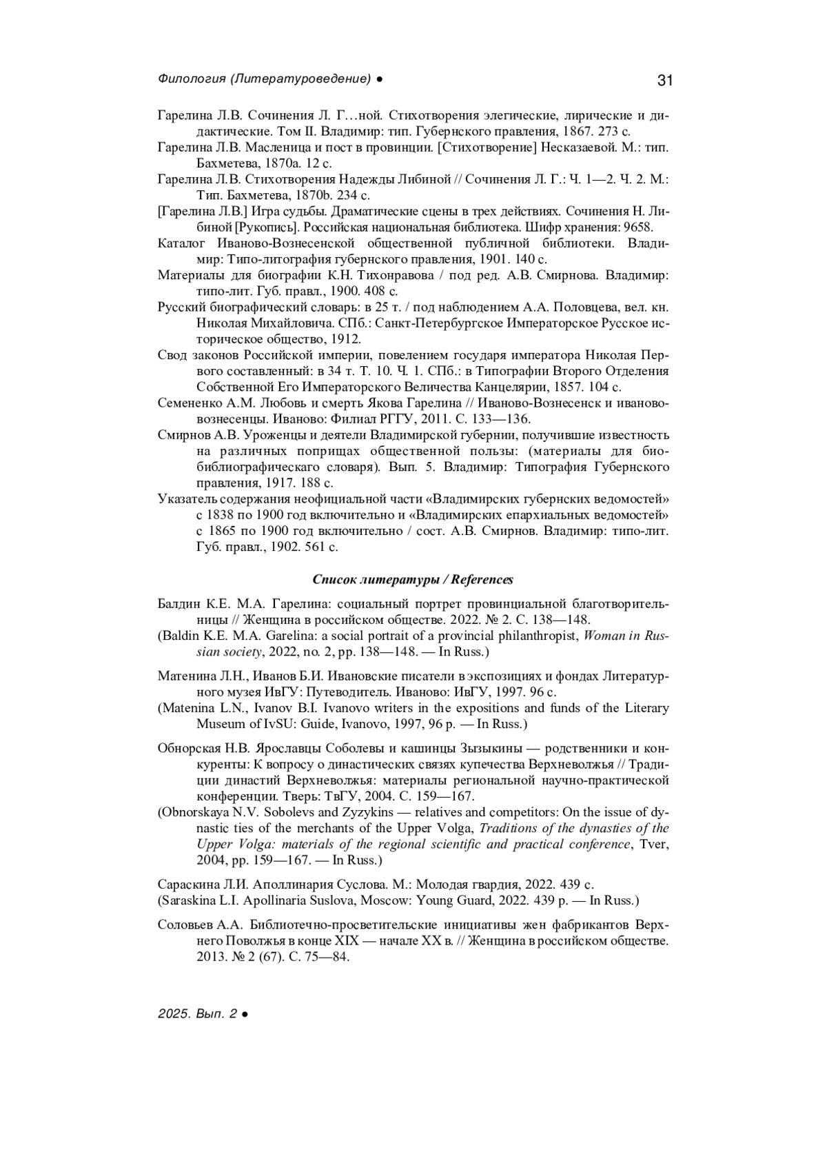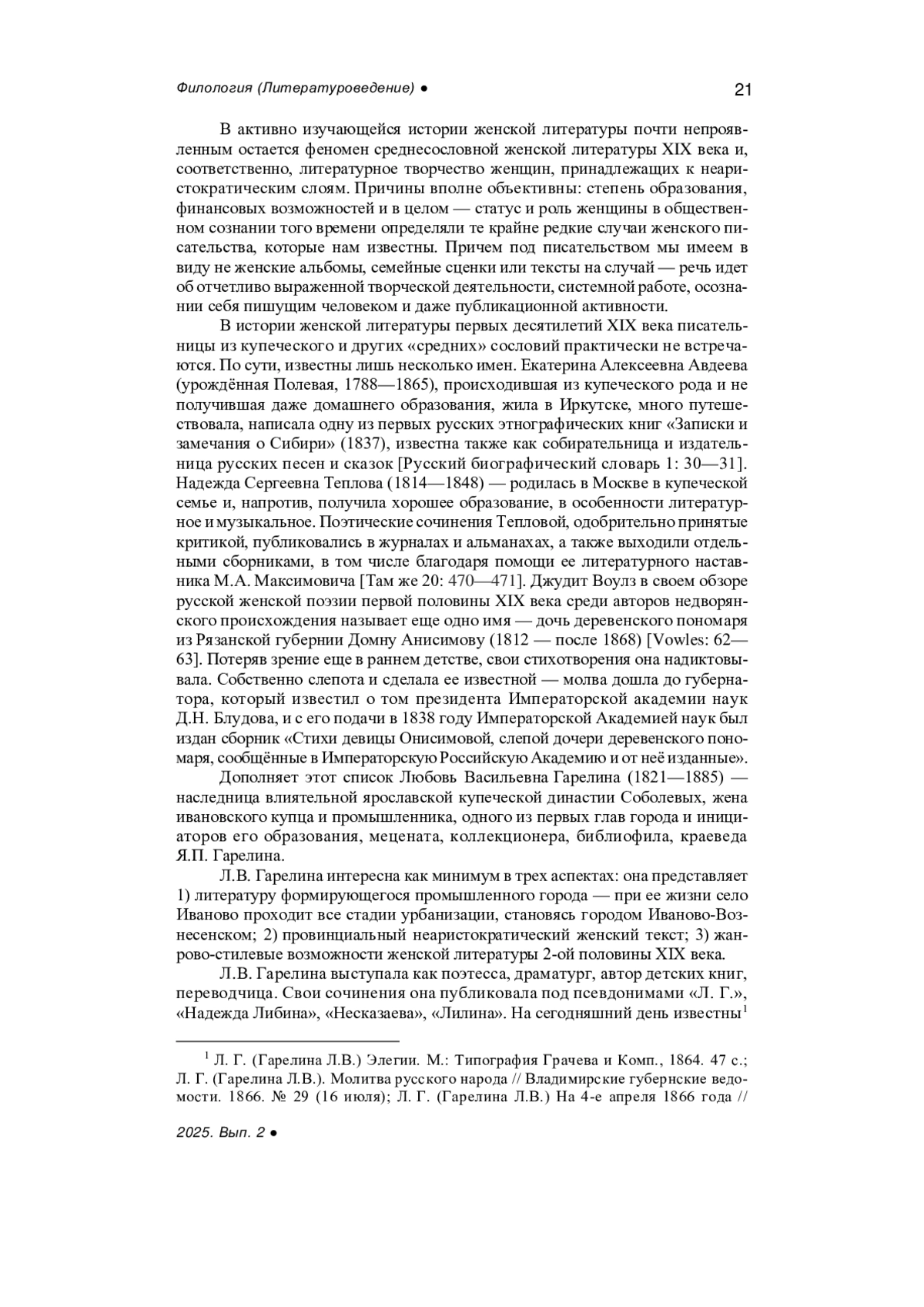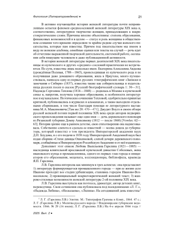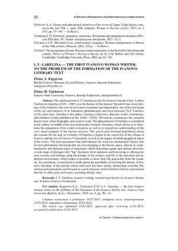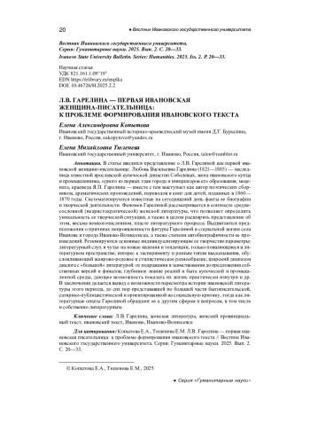 КОПЫТОВА Е. А., ТЮЛЕНЕВА Е. М. Л. В. ГАРЕЛИНА - ПЕРВАЯ ИВАНОВСКАЯ ЖЕНЩИНА-ПИСАТЕЛЬНИЦА: К ПРОБЛЕМЕ ФОРМИРОВАНИЯ ИВАНОВСКОГО ТЕКСТА // ВЕСТНИК ИВАНОВСКОГО ГОСУДАРСТВЕННОГО УНИВЕРСИТЕТА. СЕРИЯ: ГУМАНИТАРНЫЕ НАУКИ. 2025. № 2