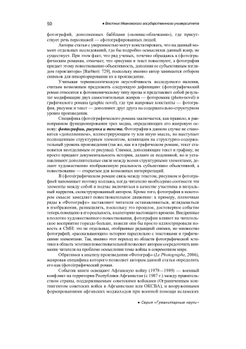 В статье рассматривается пример (фото)графического романа на материале произведения французских авторов Д. Лефевра, Э. Гибера, Ф. Лемерсье «Фотограф» (Le Photographe, 2006), где текст, рисунок и фотография являются равнозначными структурно-художественными компонентами. «Фотограф» рассказывает историю одного из авторов книги, Дидье Лефевра, работавшего в качестве военного корреспондента в 1986 году в Афганистане. Выявляется жанровое своеобразие анализируемого произведения, обусловленное в т. ч. и репрезентативностью таких романных подвидов, как автофикциональный роман, исторический роман, биографический роман, документальный роман, роман о военном фотографе и др., взаимодействующих в пределах одного текстового поля. Авторы статьи обращают особое внимание на эксплицитную структурную составляющую «Фотографа» — фотографию, обеспечивающую возможность многочисленных интерпретаций образов и сюжетно -мотивного комплекса произведения. В результате устанавливается, что наряду с графическим изображением и текстом фотография становится одним из основополагающих структурных элементов, которая позволяет авторам воссоздать «субъективную объективность» в осмыслении военных событий в Афганистане: так, с помощью скрещивания нескольких жанровых форм и стратегией документальности, обеспеченной за счет фотографических снимков, они выносят обвинительный приговор войне как враждебной людям и разрушающей человеческие жизни стихии