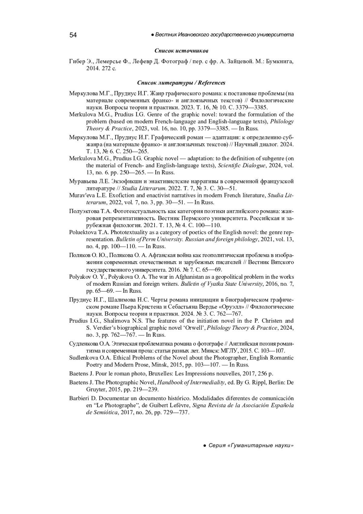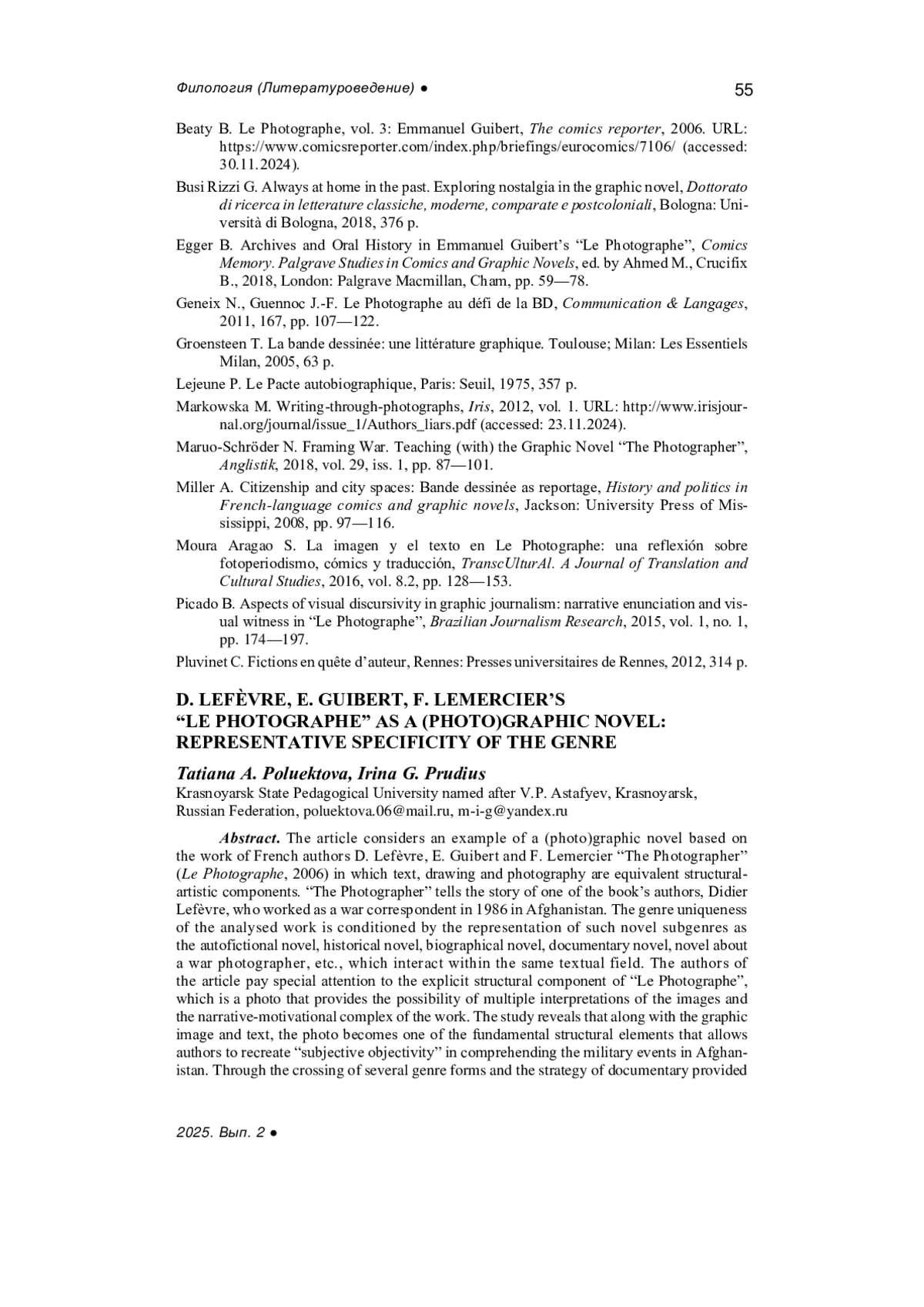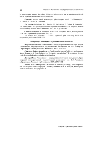 ПОЛУЭКТОВА Т. А., ПРУДИУС И. Г. «ФОТОГРАФ» Д. ЛЕФЕВРА, Э. ГИБЕРА, Ф. ЛЕМЕРСЬЕ КАК (ФОТО)ГРАФИЧЕСКИЙ РОМАН: РЕПРЕЗЕНТАТИВНАЯ СПЕЦИФИКА ЖАНРА // ВЕСТНИК ИВАНОВСКОГО ГОСУДАРСТВЕННОГО УНИВЕРСИТЕТА. СЕРИЯ: ГУМАНИТАРНЫЕ НАУКИ. 2025. № 2