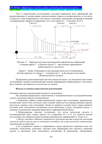 Выводы. Повышение эффекта вибродинамической защиты зданий и сооружений от техногенных динамических воздействий может быть достигнуто при создании экрана из аэрированного грунта на пути распространения упругих волн. В теоретических исследованиях и экспериментальных лабораторных исследованиях получено снижение амплитуд смещений поверхностного слоя водонасыщенного грунта в 2–3 раза. Ожидается, что в натурных условиях, с учётом затухания волн деформаций в аэрированном слое грунта, ускорения колебаний грунта могут быть снижены в 6 – 15 раз. Опытное апробирование исследованного способа защиты показало его высокую эффективность.