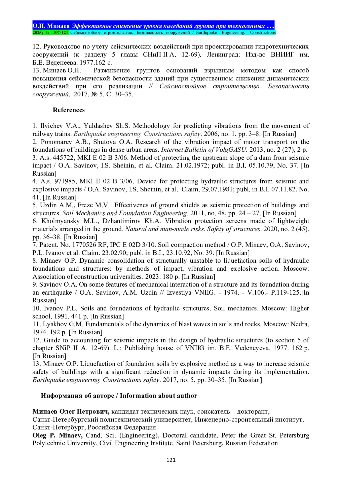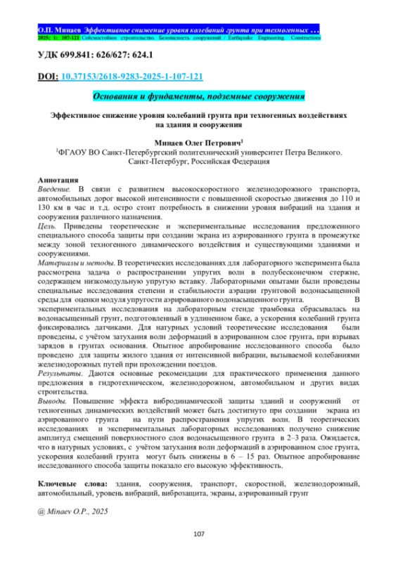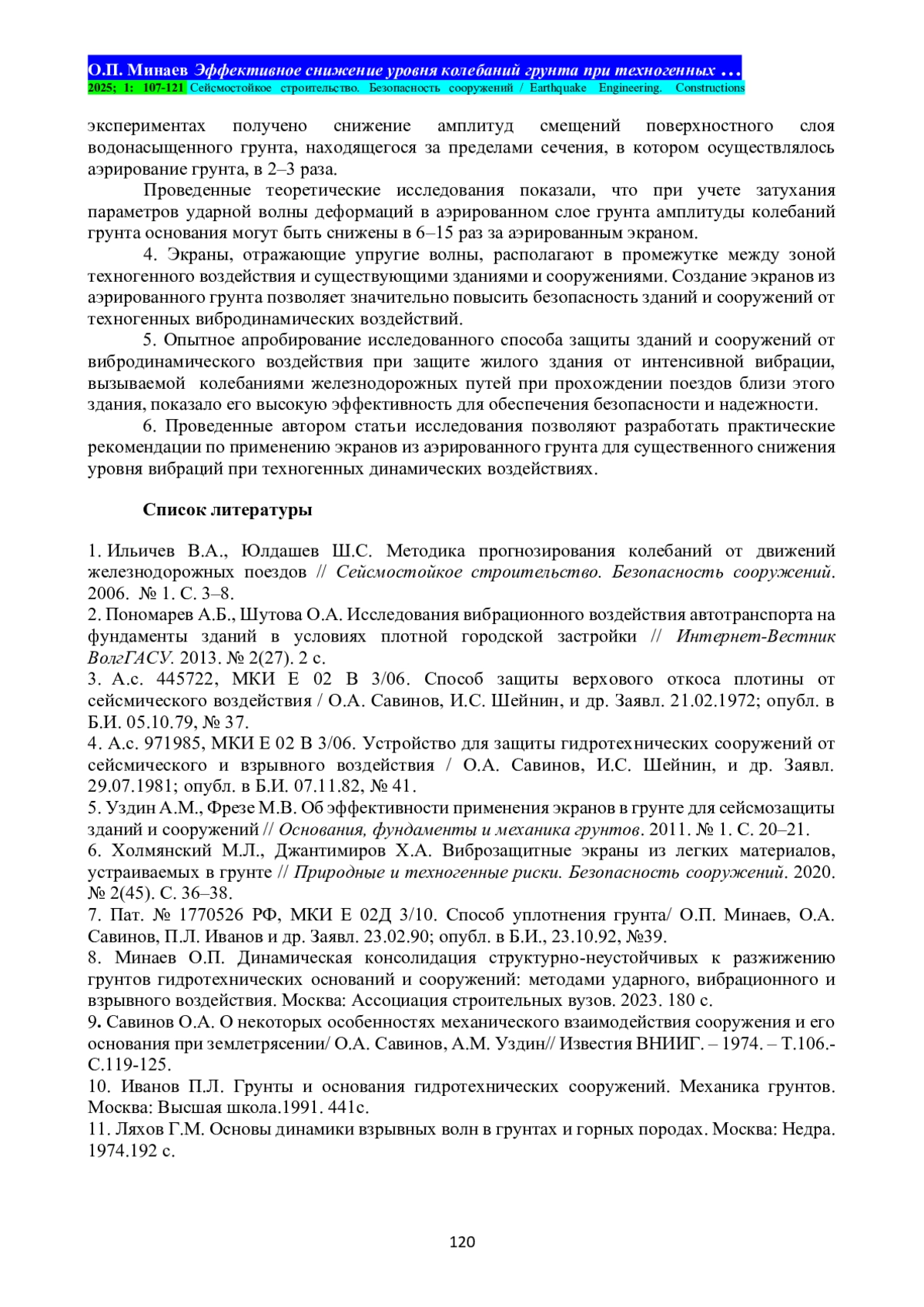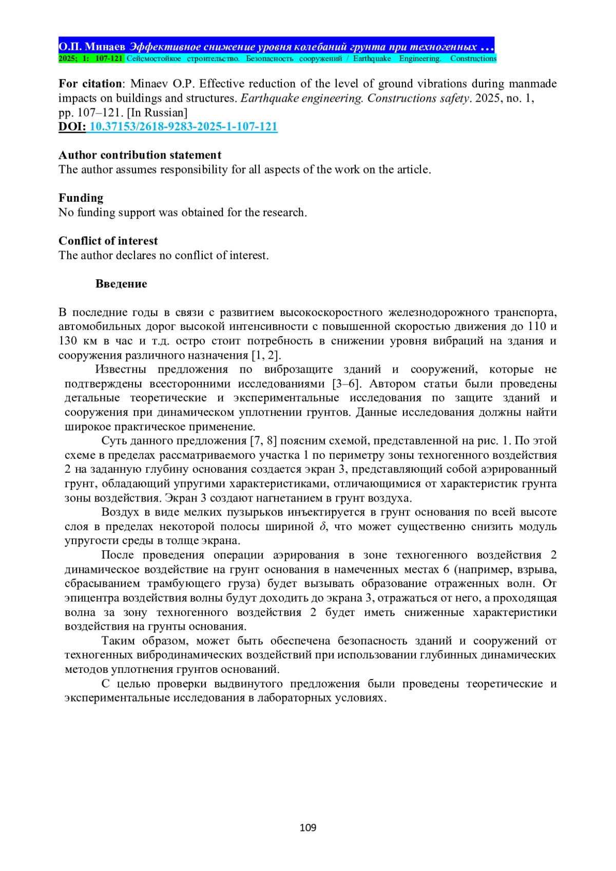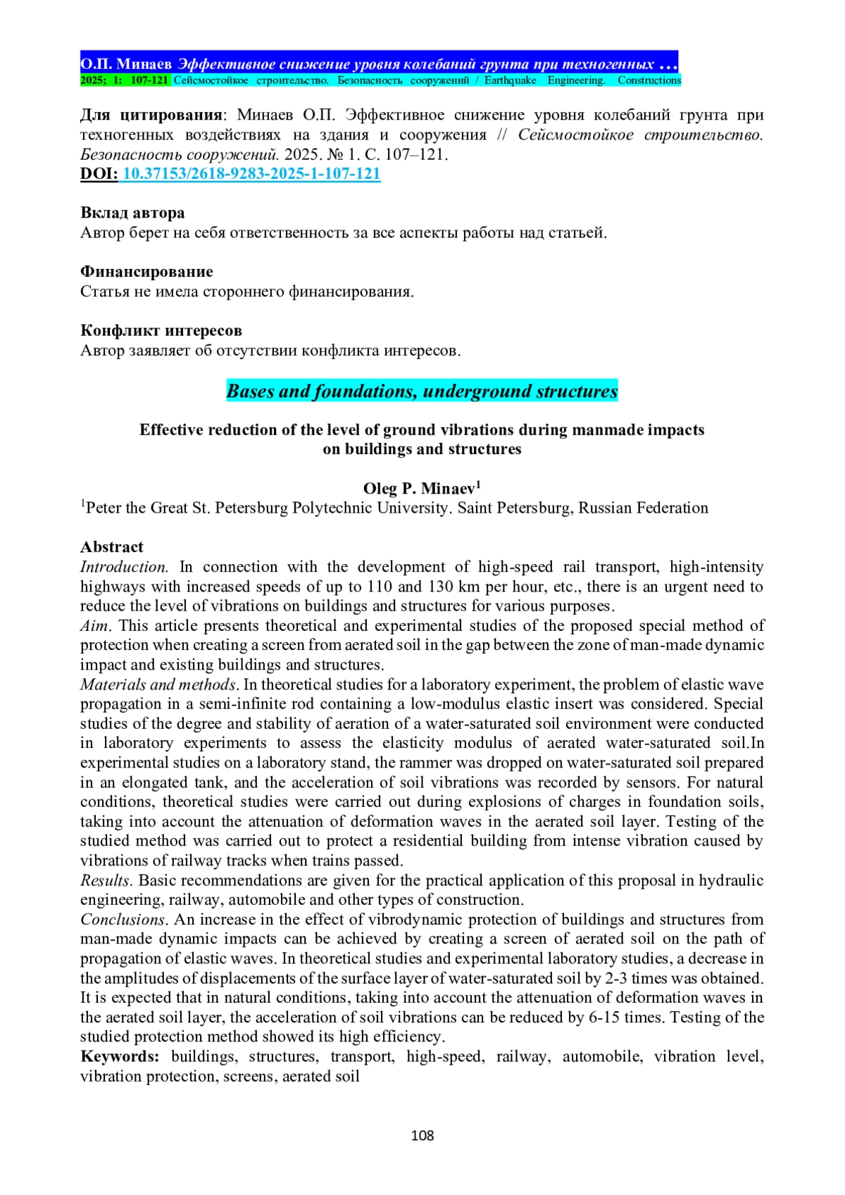 МИНАЕВ О. П. ЭФФЕКТИВНОЕ СНИЖЕНИЕ УРОВНЯ КОЛЕБАНИЙ ГРУНТА ПРИ ТЕХНОГЕННЫХ ВОЗДЕЙСТВИЯХ НА ЗДАНИЯ И СООРУЖЕНИЯ // СЕЙСМОСТОЙКОЕ СТРОИТЕЛЬСТВО. БЕЗОПАСНОСТЬ СООРУЖЕНИЙ. 2025. № 1