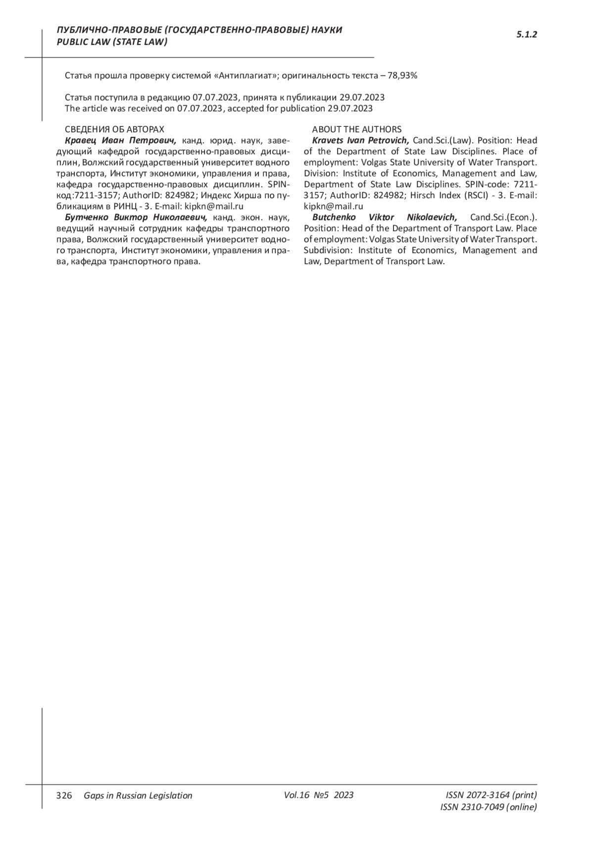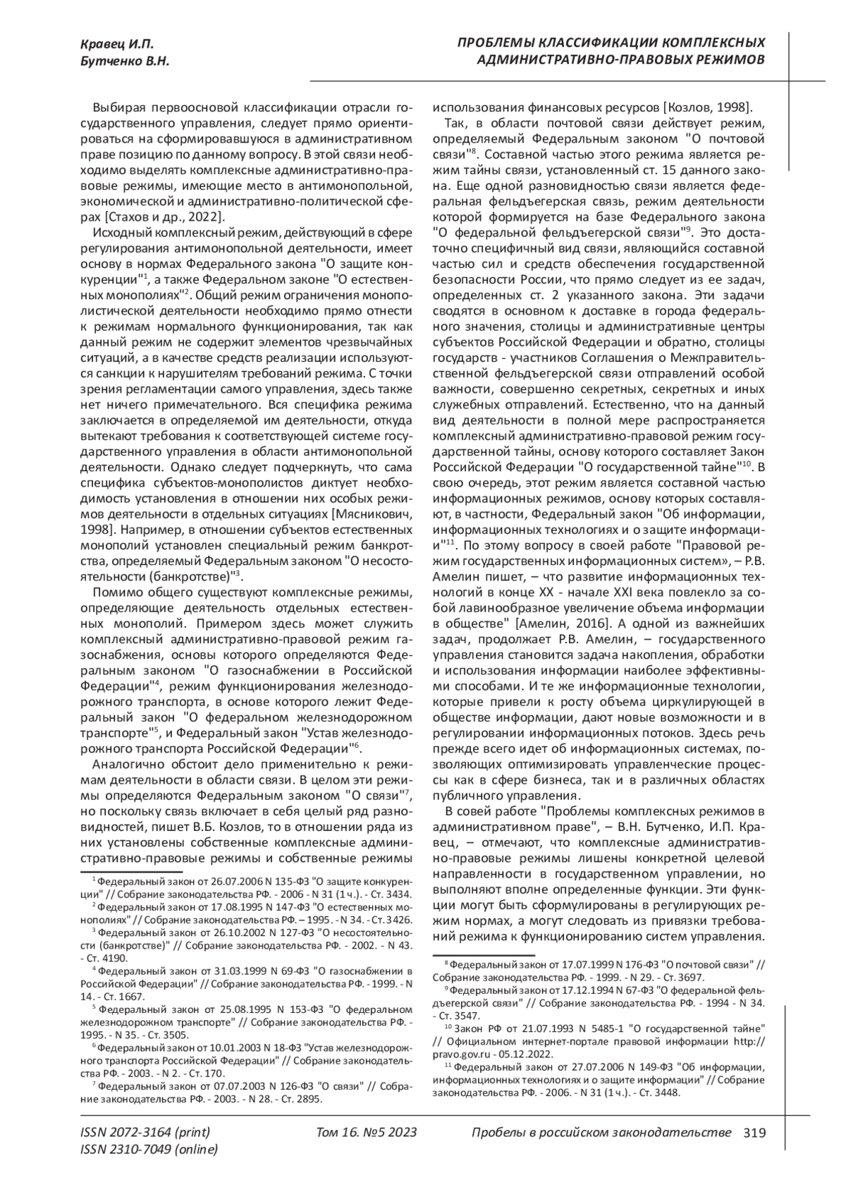 КРАВЕЦ И. П., БУТЧЕНКО В. Н. ПРОБЛЕМЫ КЛАССИФИКАЦИИ КОМПЛЕКСНЫХ АДМИНИСТРАТИВНО-ПРАВОВЫХ РЕЖИМОВ // ПРОБЕЛЫ В РОССИЙСКОМ ЗАКОНОДАТЕЛЬСТВЕ. 2023. Т. 16 № 5