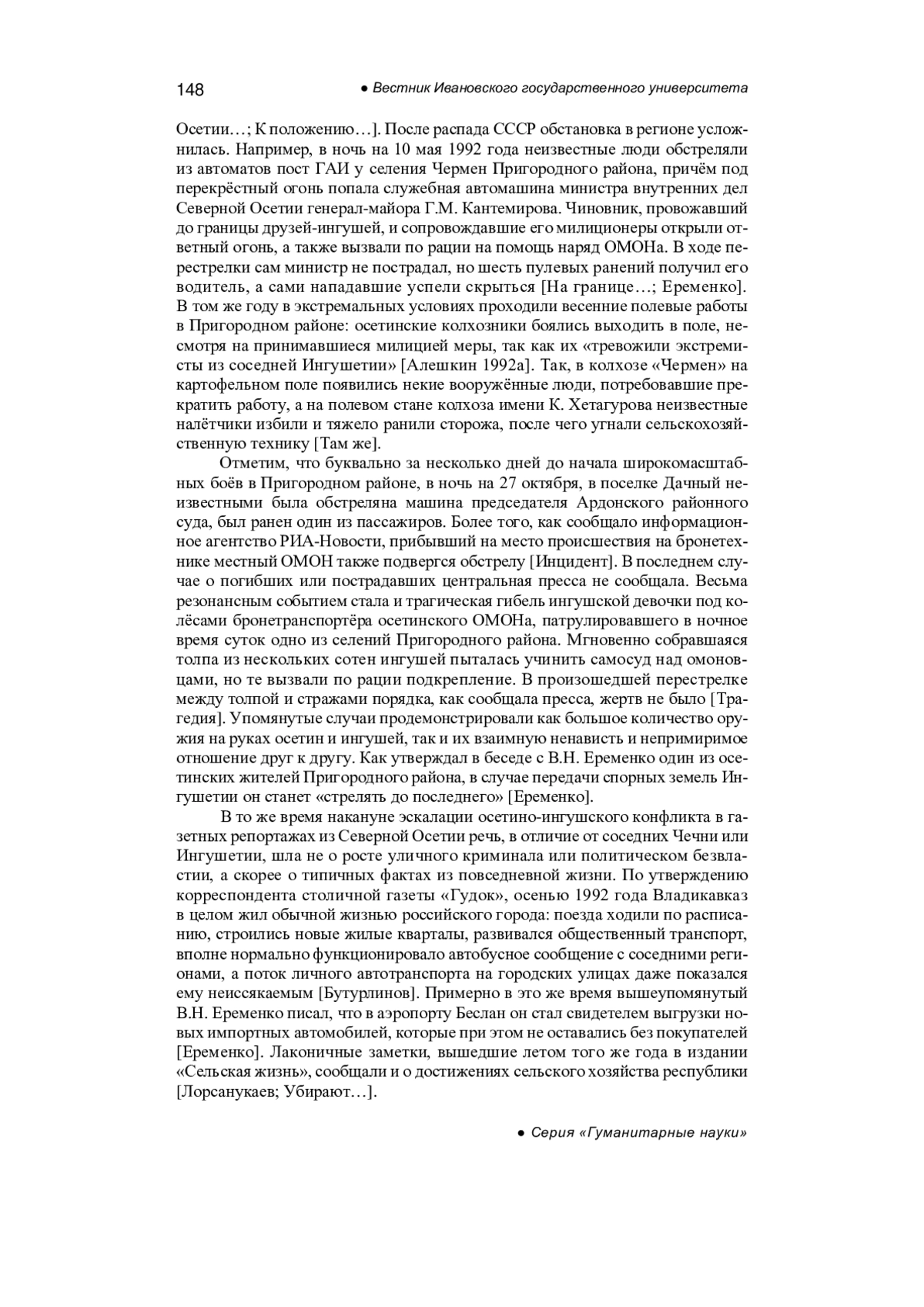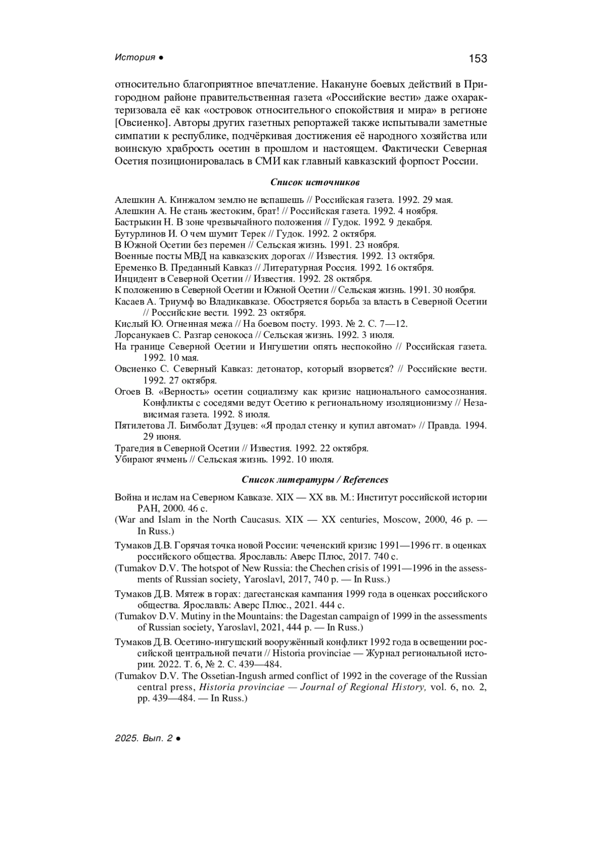 22. Тумаков Д.В. Осетино-ингушский вооружённый конфликт 1992 года в освещении российской центральной печати // Historia provinciae - Журнал региональной истории. 2022. Т. 6, № 2. С. 439-484. EDN: VQPZSX
