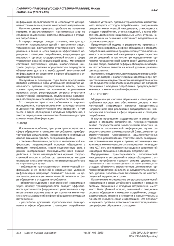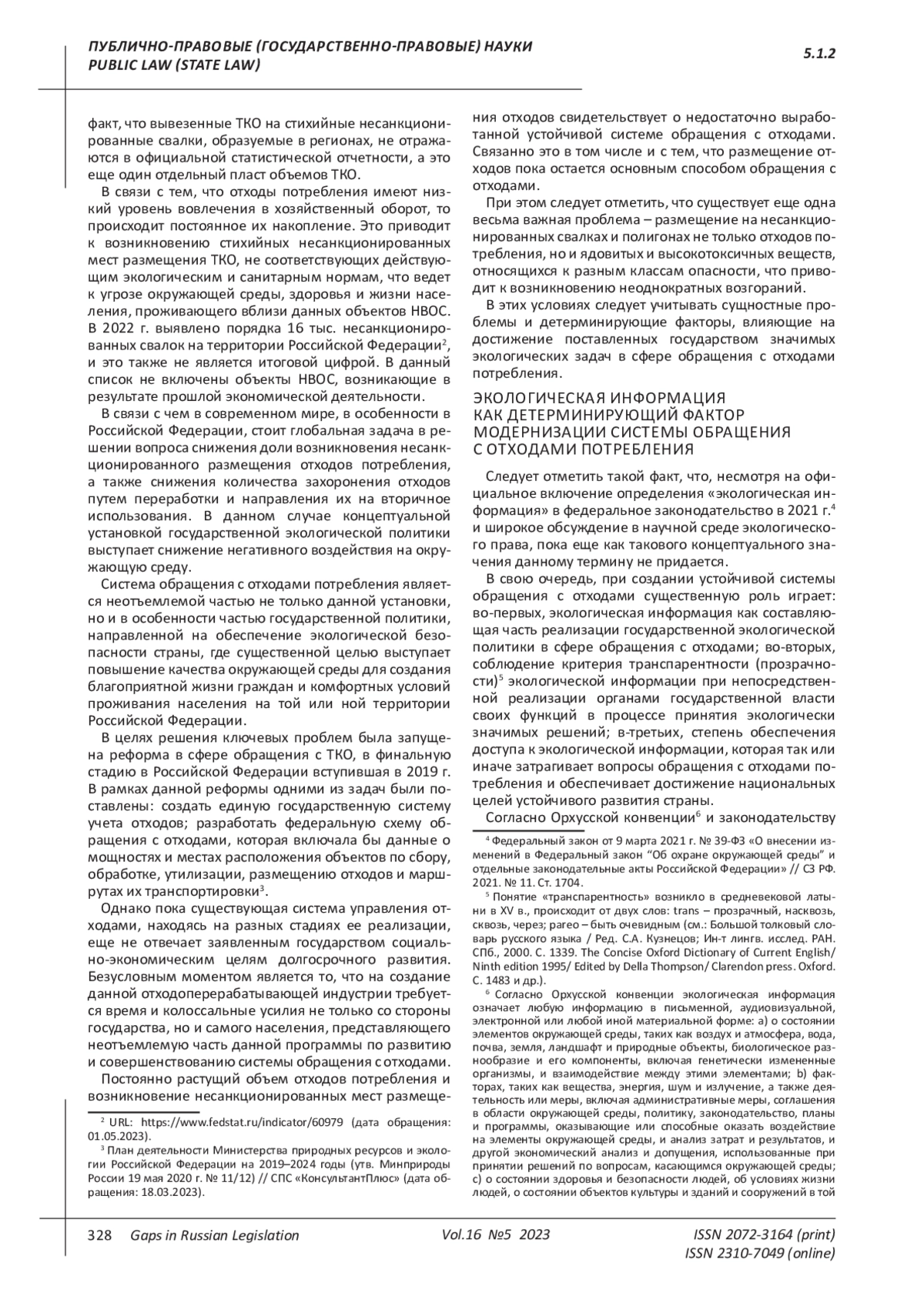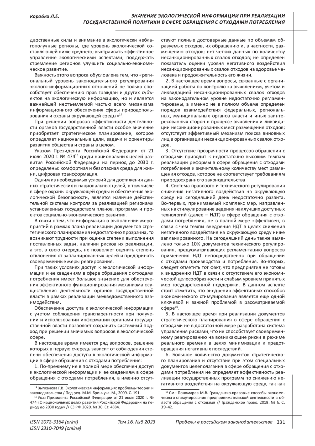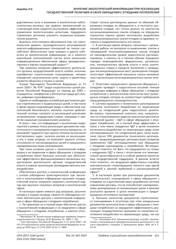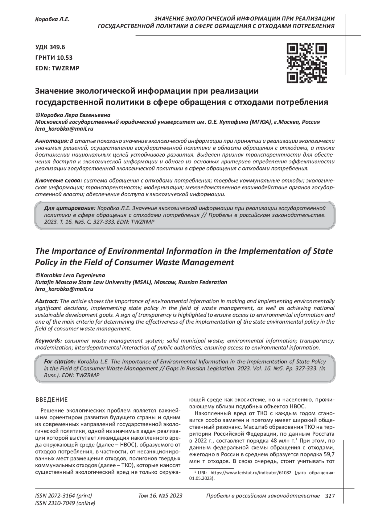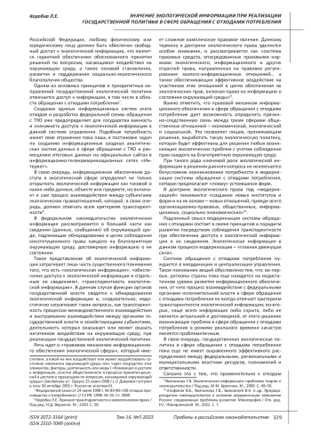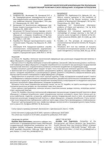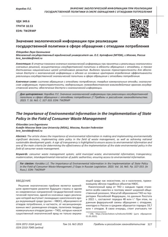 КОРОБКА Л. Е. ЗНАЧЕНИЕ ЭКОЛОГИЧЕСКОЙ ИНФОРМАЦИИ ПРИ РЕАЛИЗАЦИИ ГОСУДАРСТВЕННОЙ ПОЛИТИКИ В СФЕРЕ ОБРАЩЕНИЯ С ОТХОДАМИ ПОТРЕБЛЕНИЯ // ПРОБЕЛЫ В РОССИЙСКОМ ЗАКОНОДАТЕЛЬСТВЕ. 2023. Т. 16 № 5