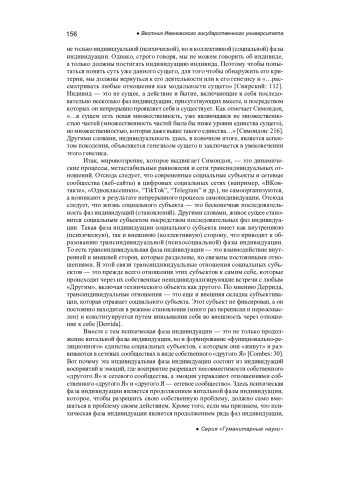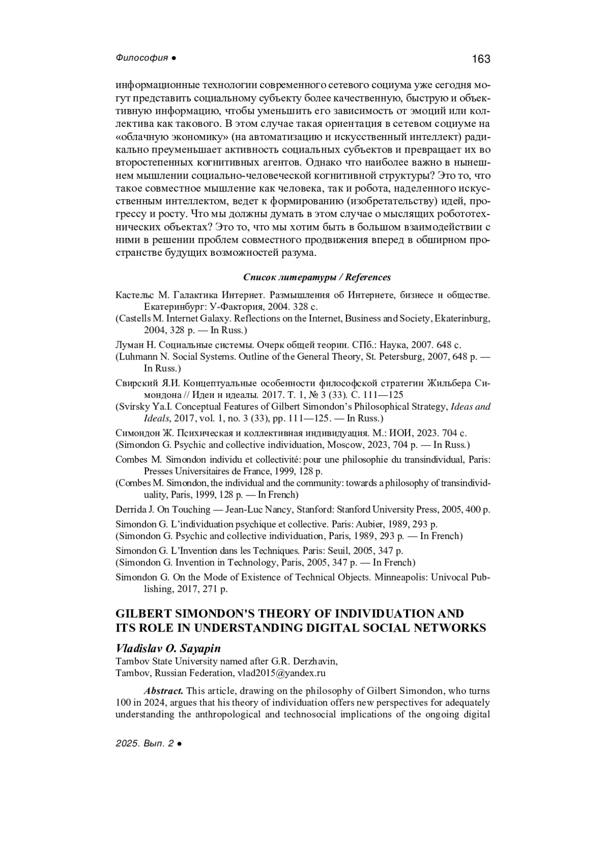 САЯПИН В. О. ТЕОРИЯ ИНДИВИДУАЦИИ ЖИЛЬБЕРА СИМОНДОНА И ЕЕ РОЛЬ В ОСМЫСЛЕНИИ ЦИФРОВЫХ СОЦИАЛЬНЫХ СЕТЕЙ // ВЕСТНИК ИВАНОВСКОГО ГОСУДАРСТВЕННОГО УНИВЕРСИТЕТА. СЕРИЯ: ГУМАНИТАРНЫЕ НАУКИ. 2025. № 2