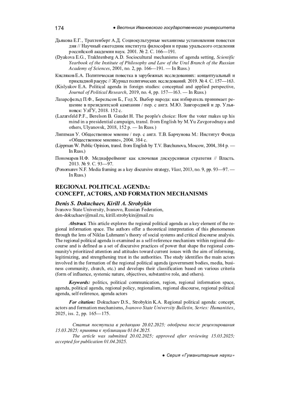 Dyakova E.G., Trakhtenberg A.D. Sociocultural mechanisms of agenda setting, Scientific Yearbook of the Institute of Philosophy and Law of the Ural Branch of the Russian Academy of Sciences, 2001, no. 2, pp. 166-191. - In Russ.