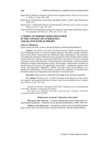 Статья посвящена феномену современного медиадискурса. В качестве методологической базы выступает системно-синергетический подход. Автор рассматривает медиадискурс в контексте представлений об информациосфере (семиосфере). Представлен опыт моделирования информационного поля на основе актуализации стандартной модели фундаментального взаимодействия в физике и квантовой теории поля. Сформулирована системно-синергетическая объяснительная модель динамики медиадискурса. Дано релевантное системное определение современного медиадискурса. Зафиксированы принципы функционирования современного медиадискурса и факторы его организованности — нелинейность, открытость, транзитивность, самоорганизация, адаптивность, устойчивость. Исследование раскрывает возможности расширения методологии социальных наук для анализа механизмов коммуникативного взаимодействия и управления процессами при формировании медиадискурса.