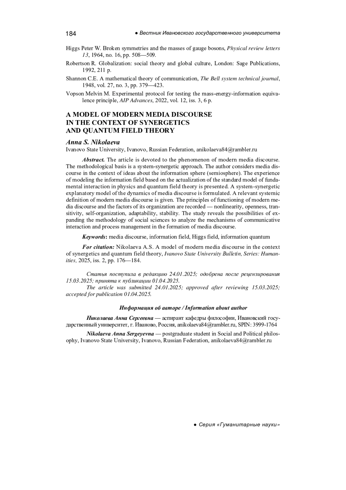 Nikolaeva A.S. Media discourse and the forming the information agenda: modern factors and trends, Regional journalism, advertising and public relations: challenges and solutions, Ivanovo, 2024, pp. 103-114. - In Russ.
