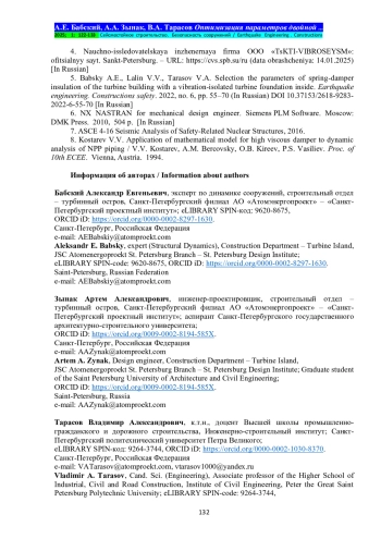 5. Бабский А.Е., Лалин В.В., Тарасов В.А. Выбор параметров пружинно-демпферной изоляции здания турбины с виброизолированным фундаментом турбоагрегата в составе // Сейсмостойкое строительство. Безопасность сооружений. 2022. № 6. С. 55-70. DOI: 10.37153/2618-9283-2022-6-55-70
