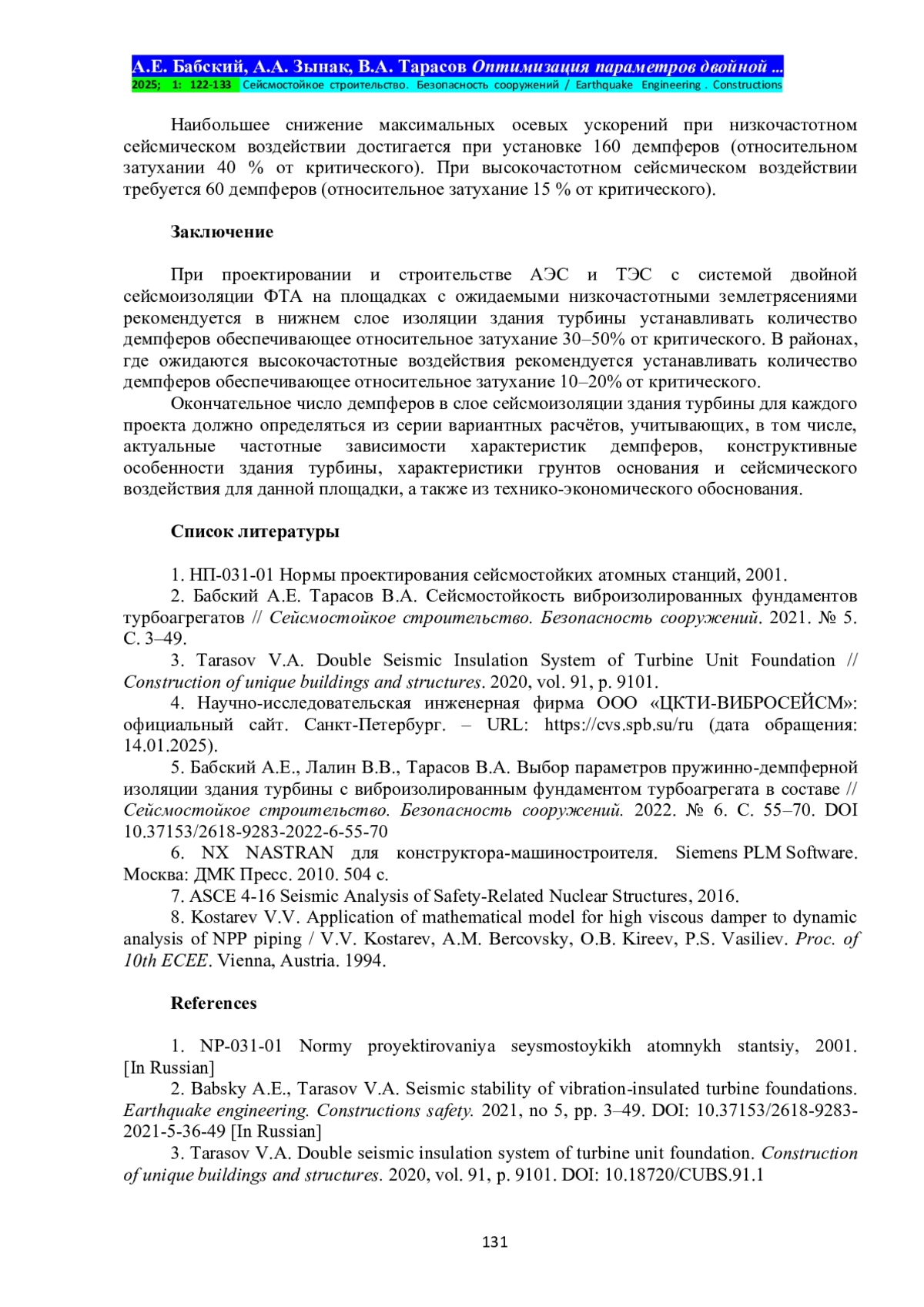 2. Бабский А.Е. Тарасов В.А. Сейсмостойкость виброизолированных фундаментов турбоагрегатов // Сейсмостойкое строительство. Безопасность сооружений. 2021. № 5. С. 3-49.