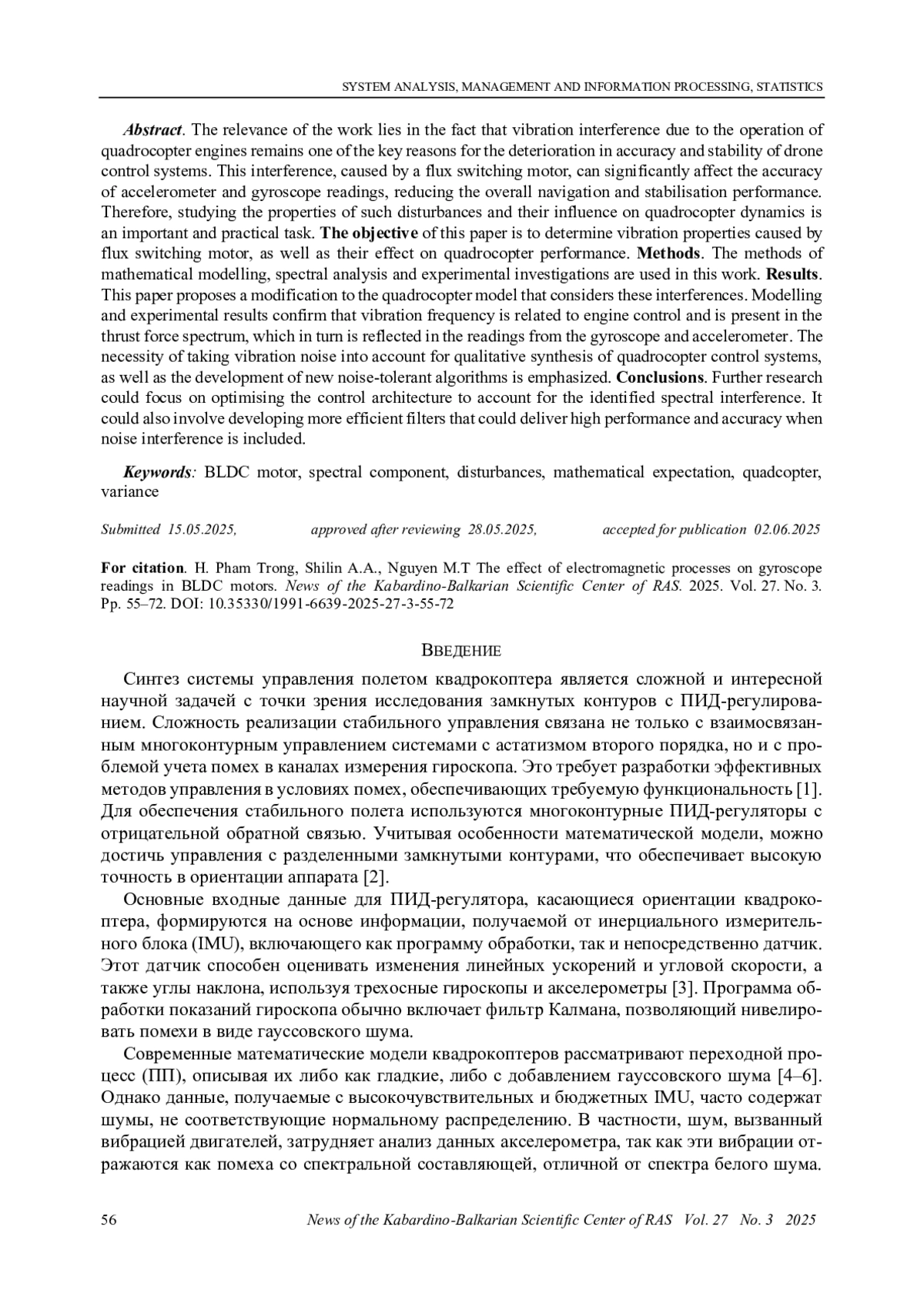 Актуальность работы заключается в том, что вибрационные помехи, возникающие вследствие работы двигателей квадрокоптера, остаются одной из ключевых причин ухудшения точности и устойчивости систем управления беспилотными летательными аппаратами. Эти помехи, вызванные переключением магнитных потоков в электродвигателях, могут существенно влиять на показания датчиков, таких как гироскопы и акселерометры, что снижает общую эффективность навигации и стабилизации. Поэтому исследование свойств таких помех и их влияния на динамику квадрокоптера является важной и практически значимой задачей.