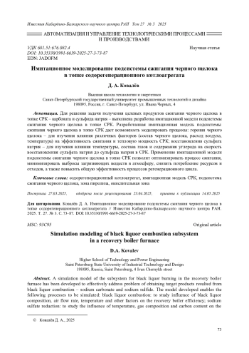 Для решения задачи получения целевых продуктов сжигания черного щелока в топке СРК - карбоната и сульфида натрия - выполнена разработка имитационной модели подсистемы сжигания черного щелока в топке СРК. Разработанная имитационная модель подсистемы сжигания черного щелока в топке СРК даст возможность моделировать процессы: горения черного щелока - для изучения влияния различных факторов (состав черного щелока, расход воздуха, температура) на эффективность сжигания и тепловую мощность СРК; восстановления сульфата натрия - для изучения влияния температуры, состава газов и содержания углерода на скорость восстановления сульфата натрия до сульфида натрия в СРК. Применение имитационной модели подсистемы сжигания черного щелока в топке СРК позволит оптимизировать процесс сжигания, минимизировать выбросы загрязняющих веществ в атмосферу, снизить потребление ресурсов и отходов, а также повысить общую эффективность процессов регенерационного цикла.