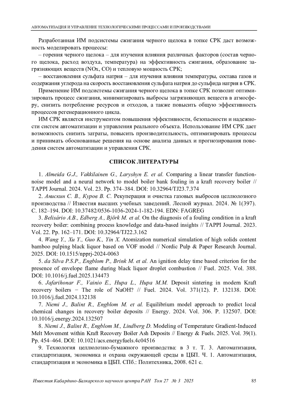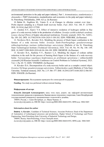 13. Ковалёв Д. А., Куркина В. В., Русинов Л. А. Моделирование степени восстановления сульфата натрия в плаве для процесса сжигания черного щелока в топке содорегенерационного котлоагрегата // Всероссийская научная конференция по проблемам управления в технических системах. 2023. Т. 1. С. 69-72. EDN: YWDMNH
