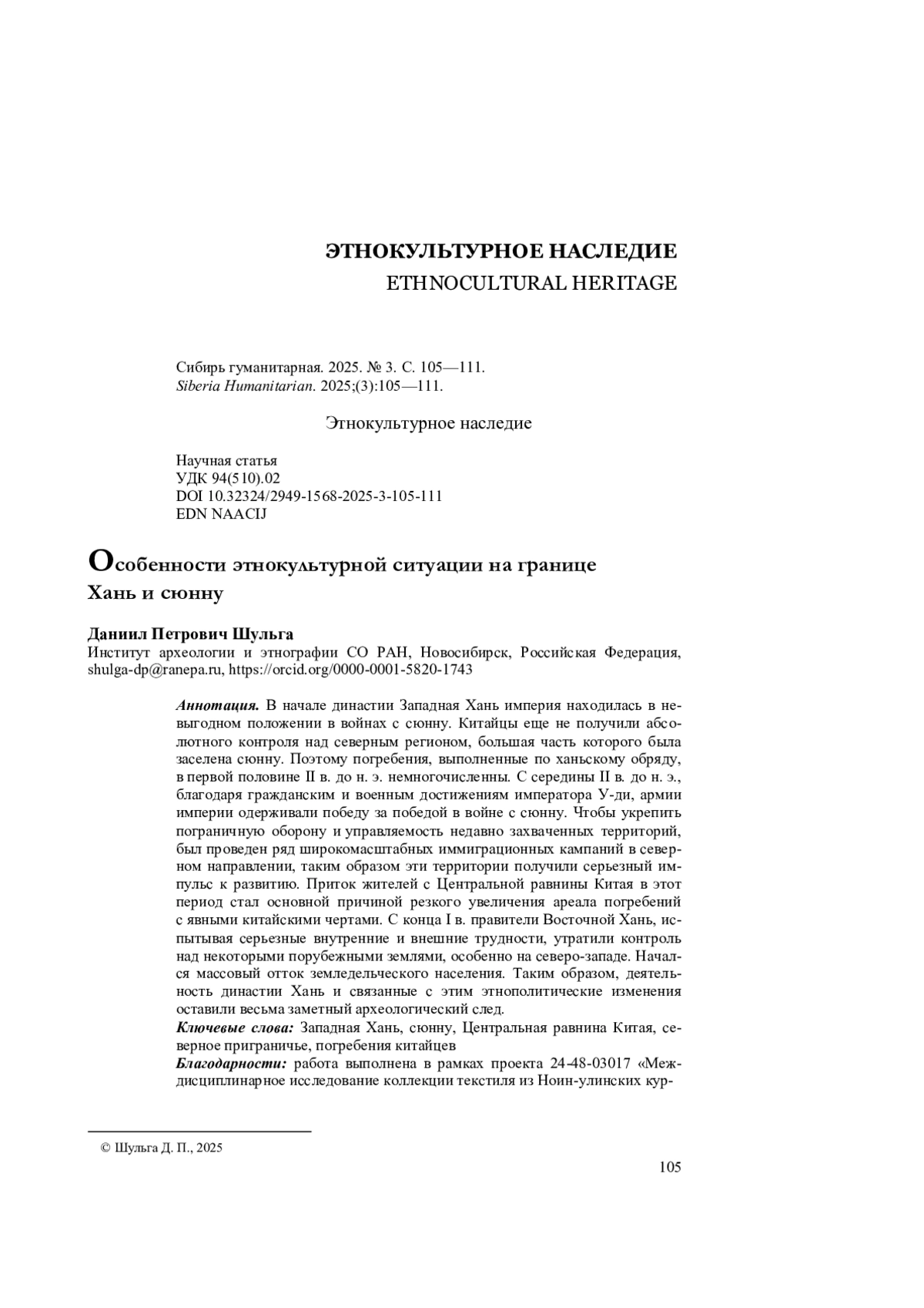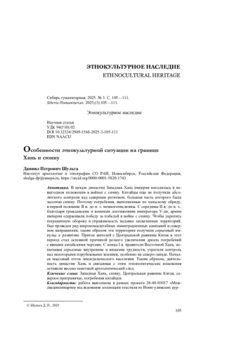 ШУЛЬГА Д. П. ОСОБЕННОСТИ ЭТНОКУЛЬТУРНОЙ СИТУАЦИИ НА ГРАНИЦЕ ХАНЬ И СЮННУ // СИБИРЬ ГУМАНИТАРНАЯ. 2025. № 3 (11)