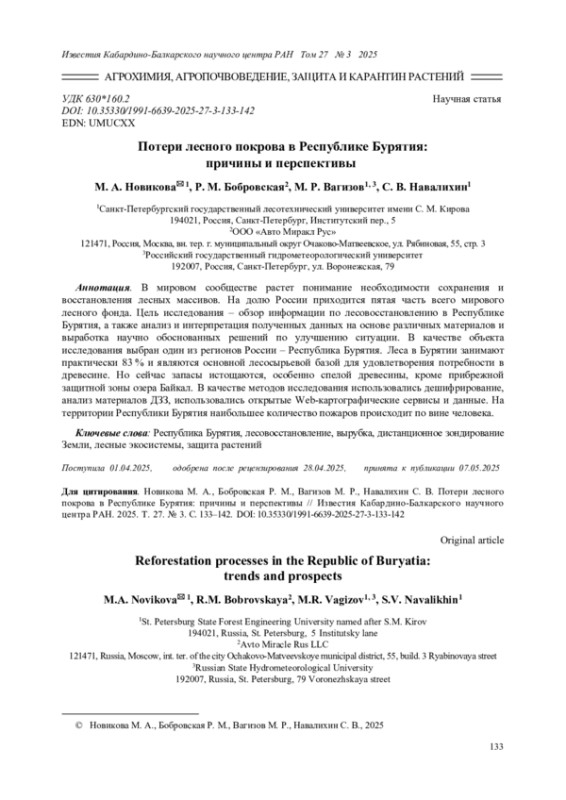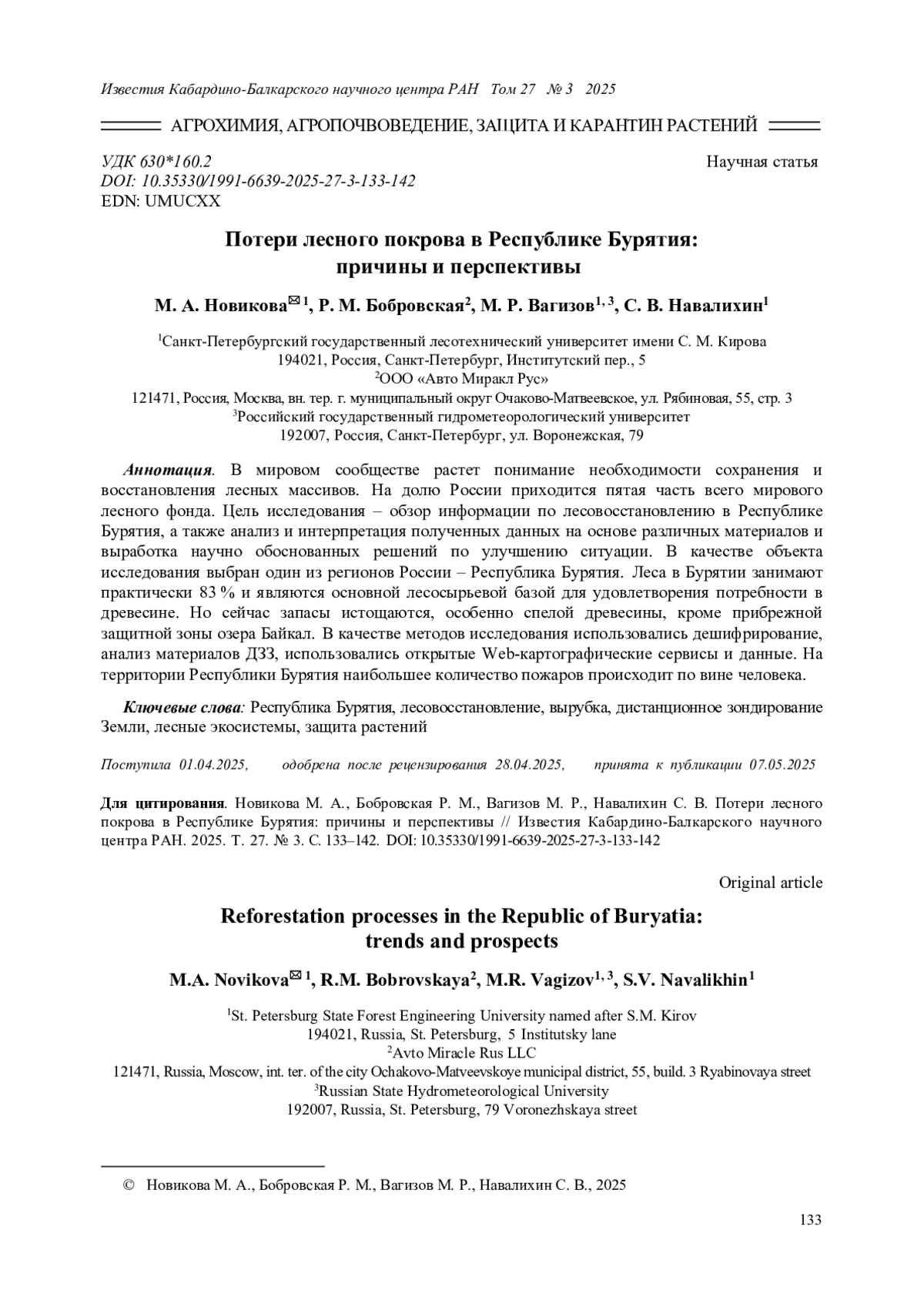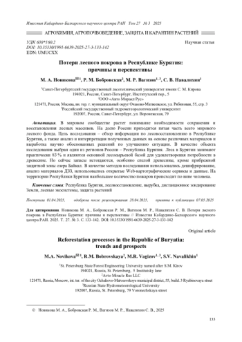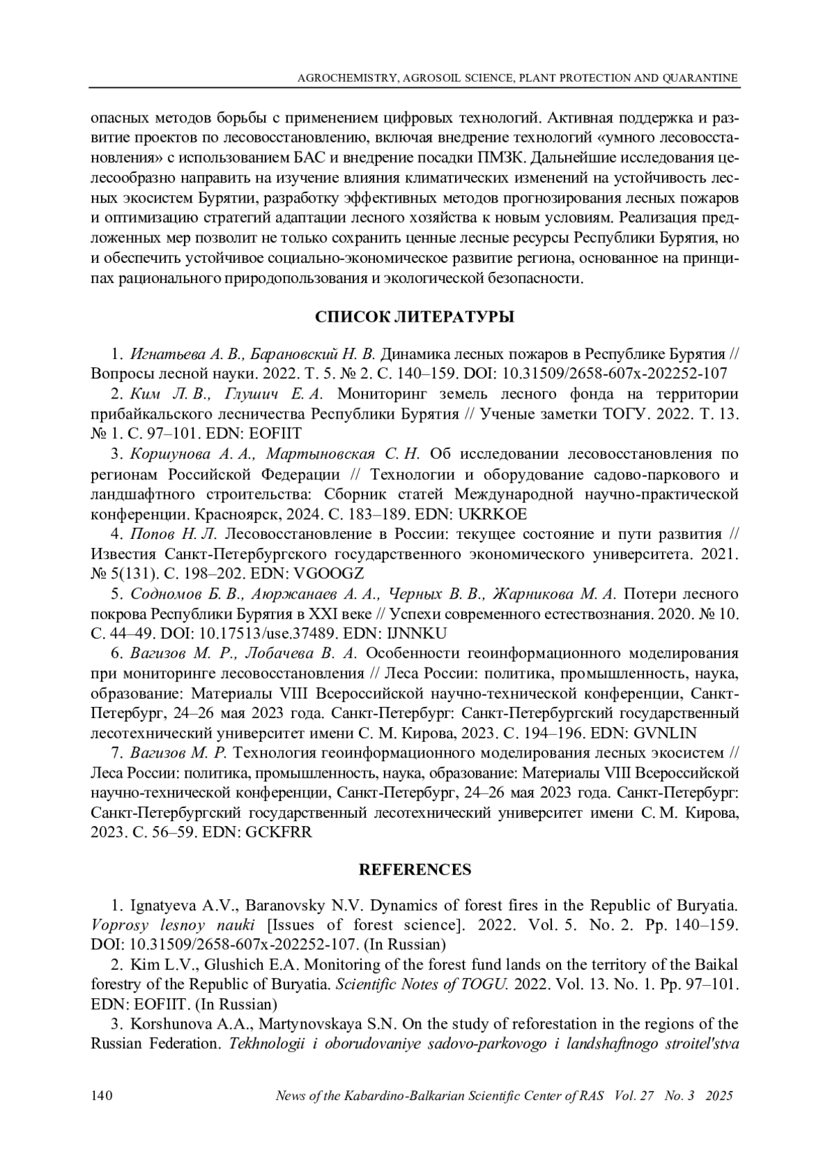 5. Содномов Б. В., Аюржанаев А. А., Черных В. В., Жарникова М. А. Потери лесного покрова Республики Бурятия в XXI веке // Успехи современного естествознания. 2020. № 10. С. 44-49. DOI: 10.17513/use.37489 EDN: IJNNKU