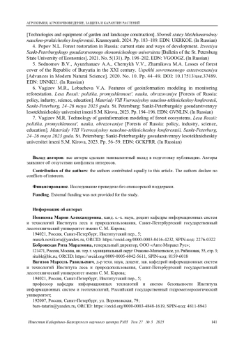 6. Вагизов М. Р., Лобачева В. А. Особенности геоинформационного моделирования при мониторинге лесовосстановления // Леса России: политика, промышленность, наука, образование: Материалы VIII Всероссийской научно-технической конференции, Санкт- Петербург, 24-26 мая 2023 года. Санкт-Петербург: Санкт-Петербургский государственный лесотехнический университет имени С. М. Кирова, 2023. С. 194-196. EDN: GVNLIN